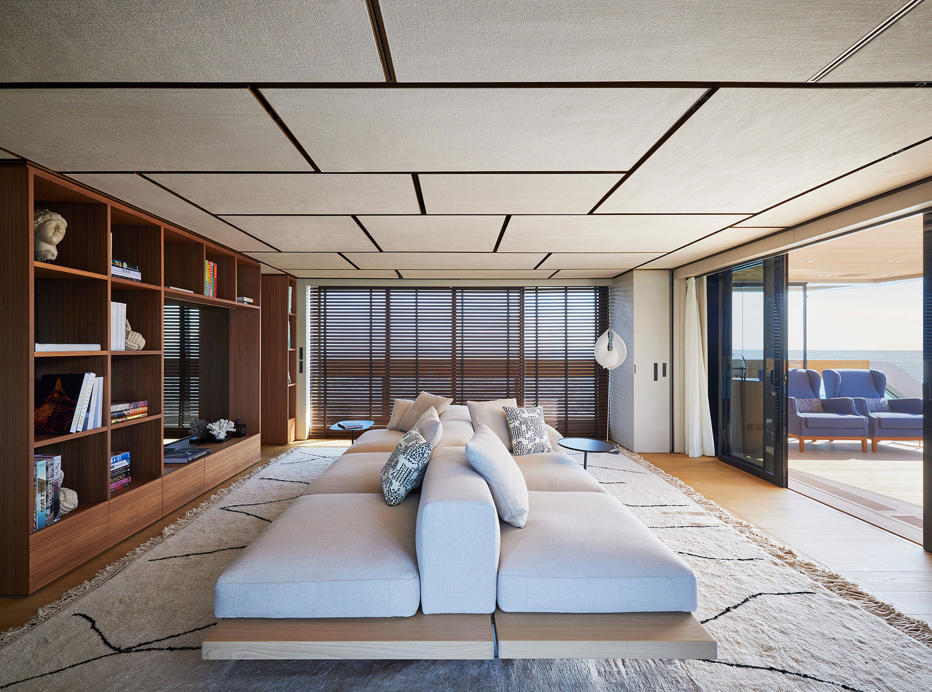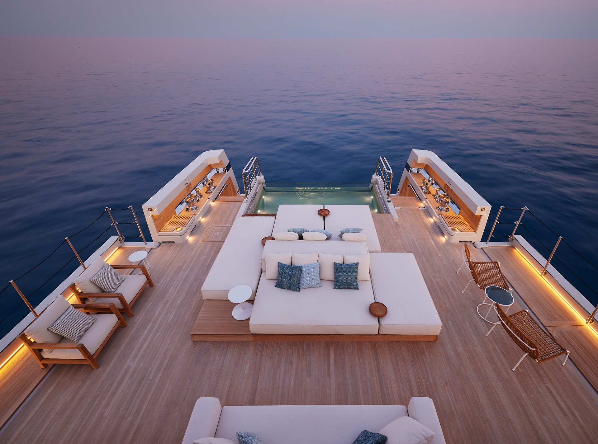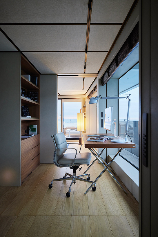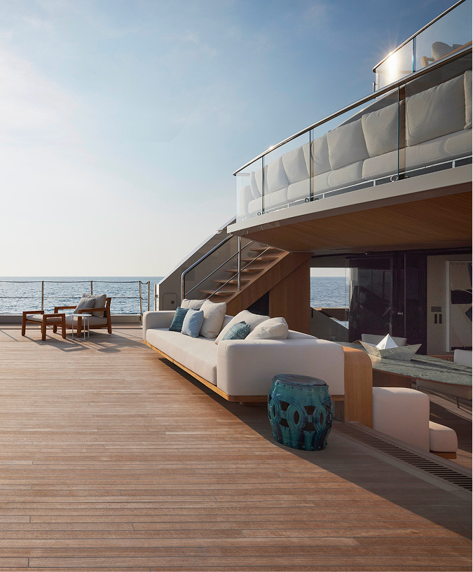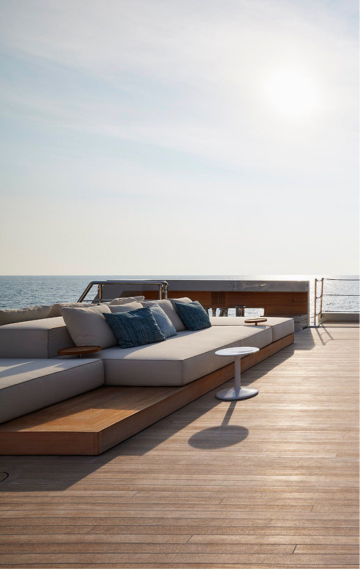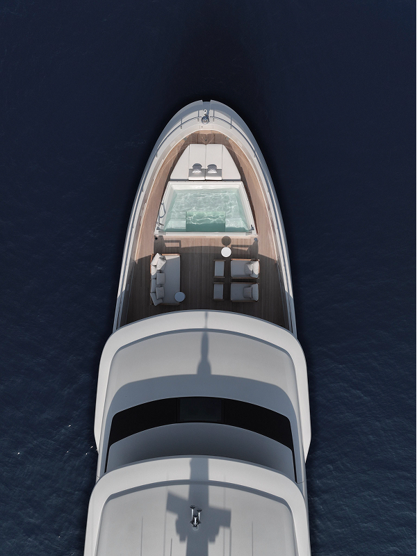 44X-Space offers extraordinary volume, headlined by its spacious aft area. This open-air living area can expand by an additional 18 square metres through folding balconies, creating a seamless connection with the adjacent interior spaces.