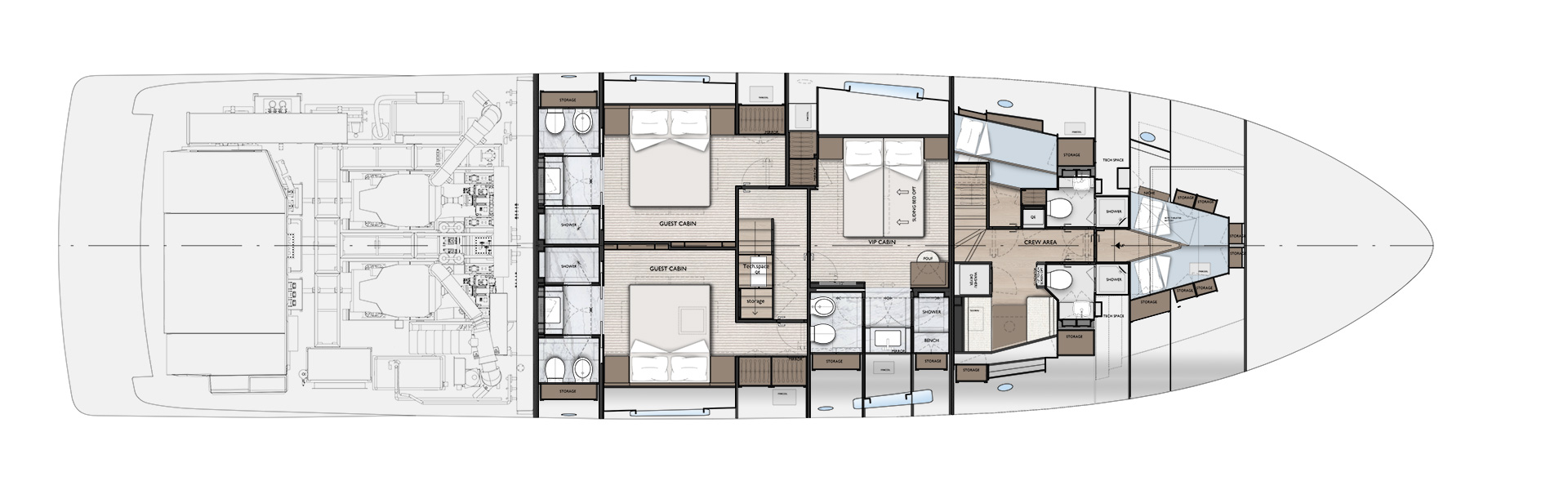 Interiors cultivate a calm, open atmosphere, uniting social areas and private retreats through large glazing and thoughtful circulation. Refined materials and tailored layouts enhance comfort, spatial clarity and the effortless flow between interior and exterior life at sea.