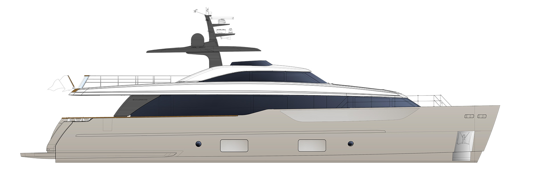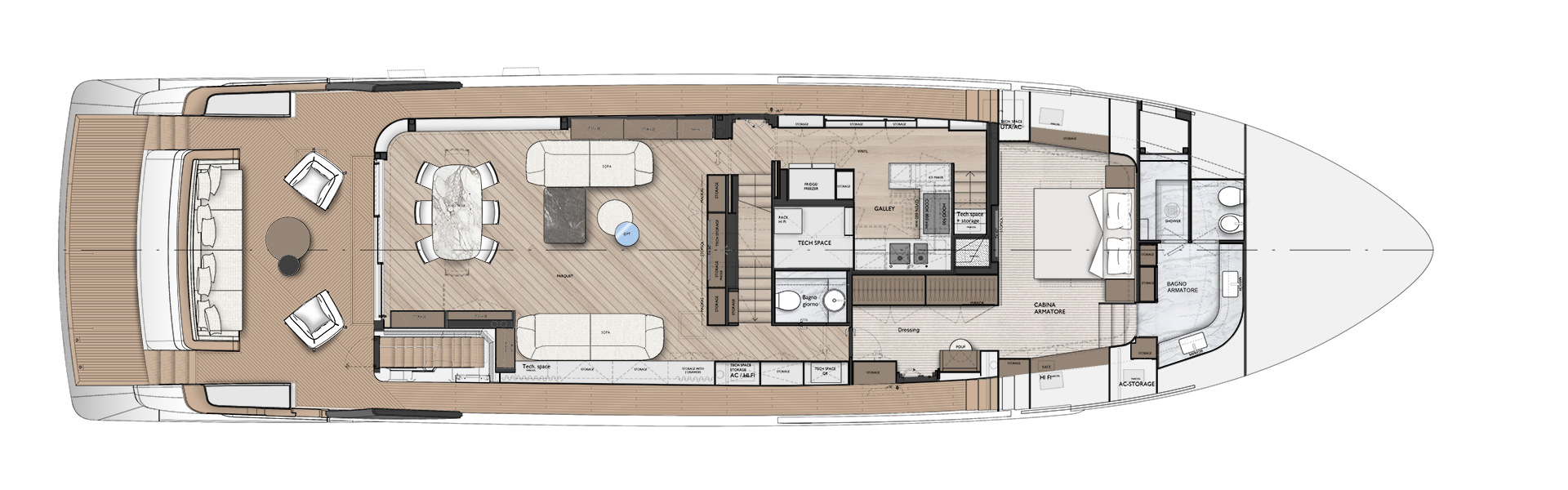 Zuccon International Project’s exterior lines combine balanced proportions with elegant presence. Generous deck spaces and fluid transitions shape a composed profile, creating harmony between form and function and redefining the semi-displacement aesthetic.