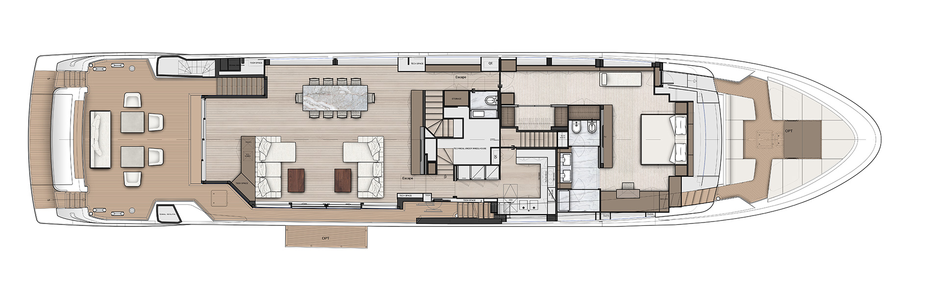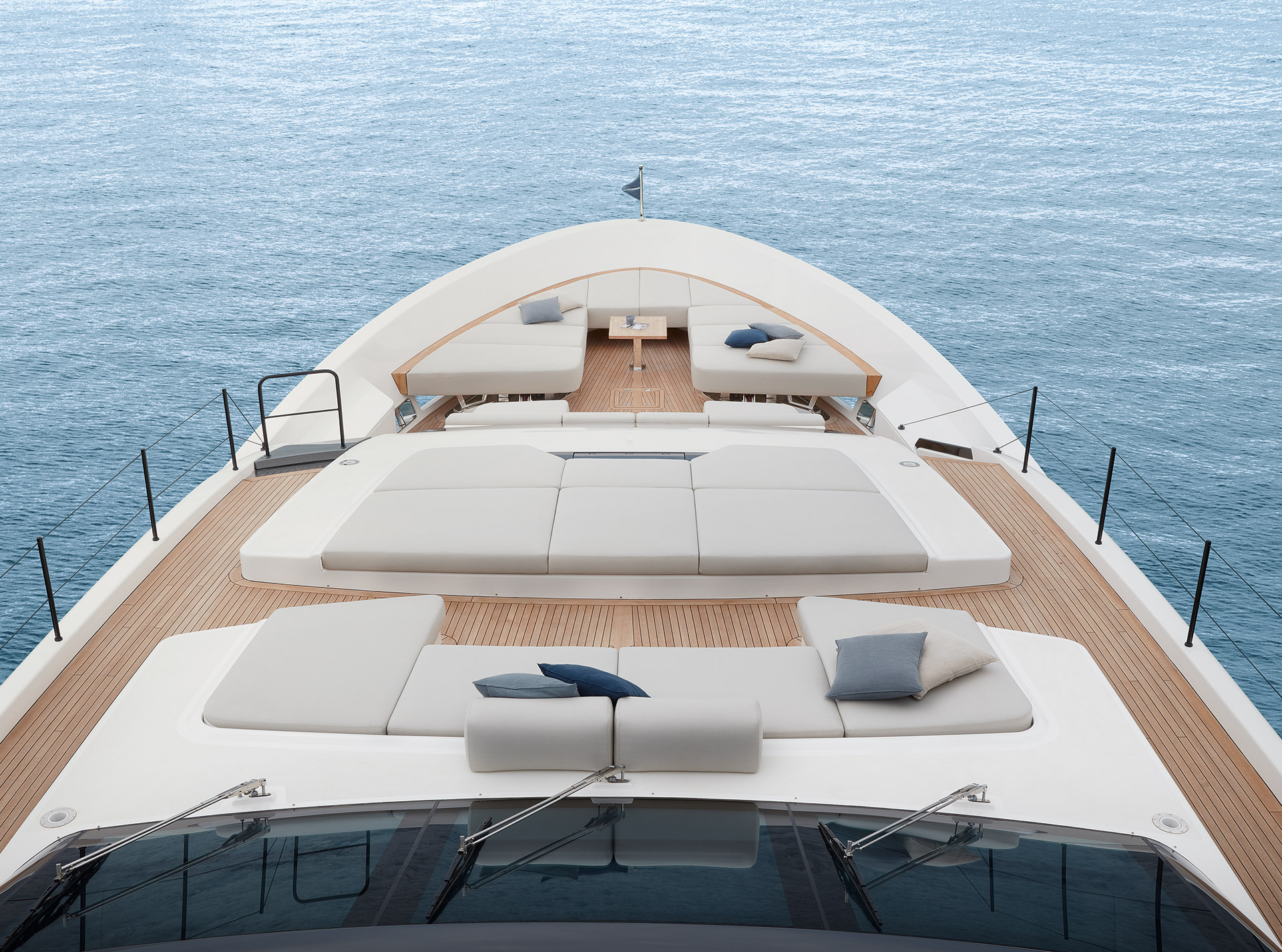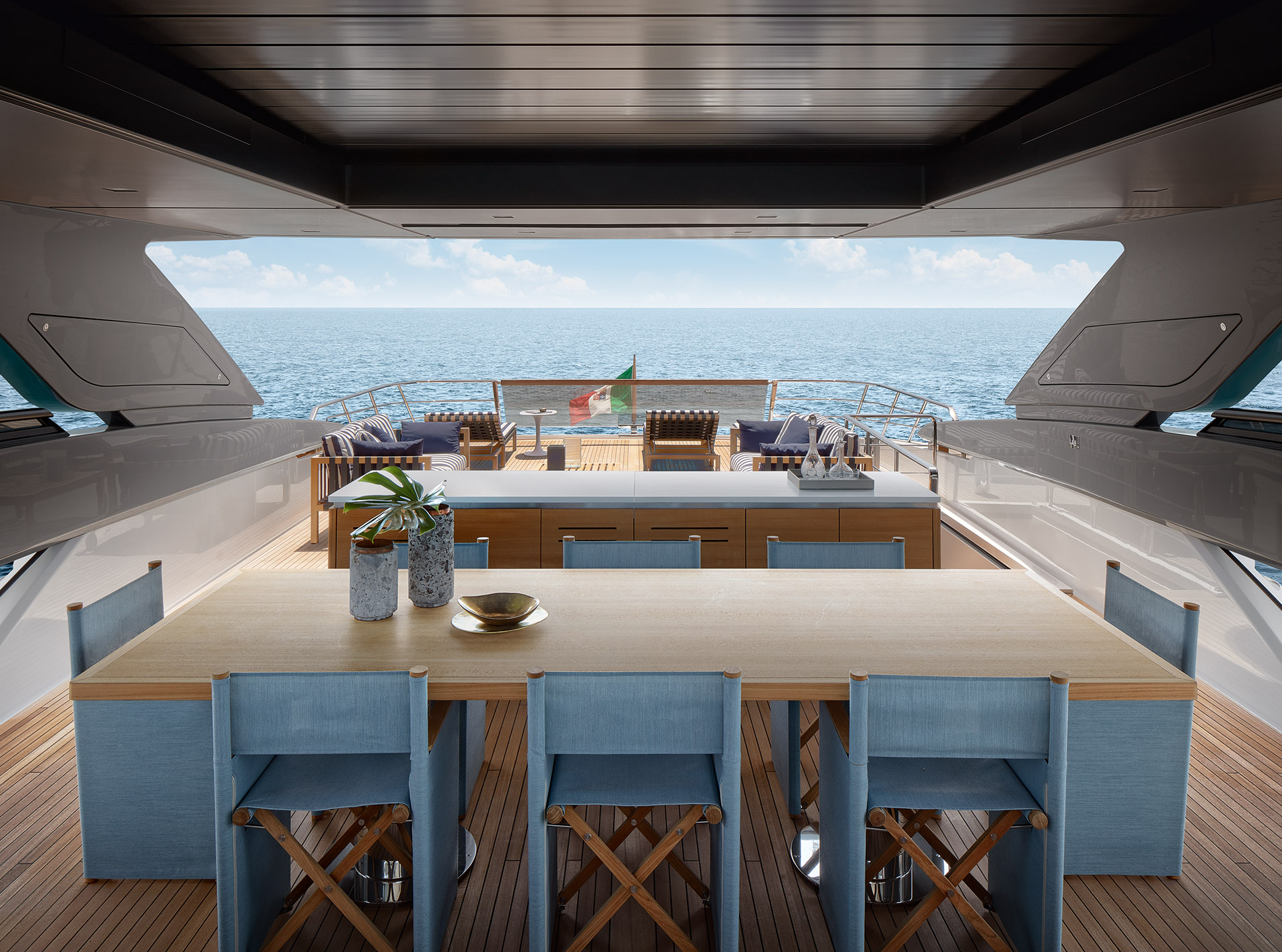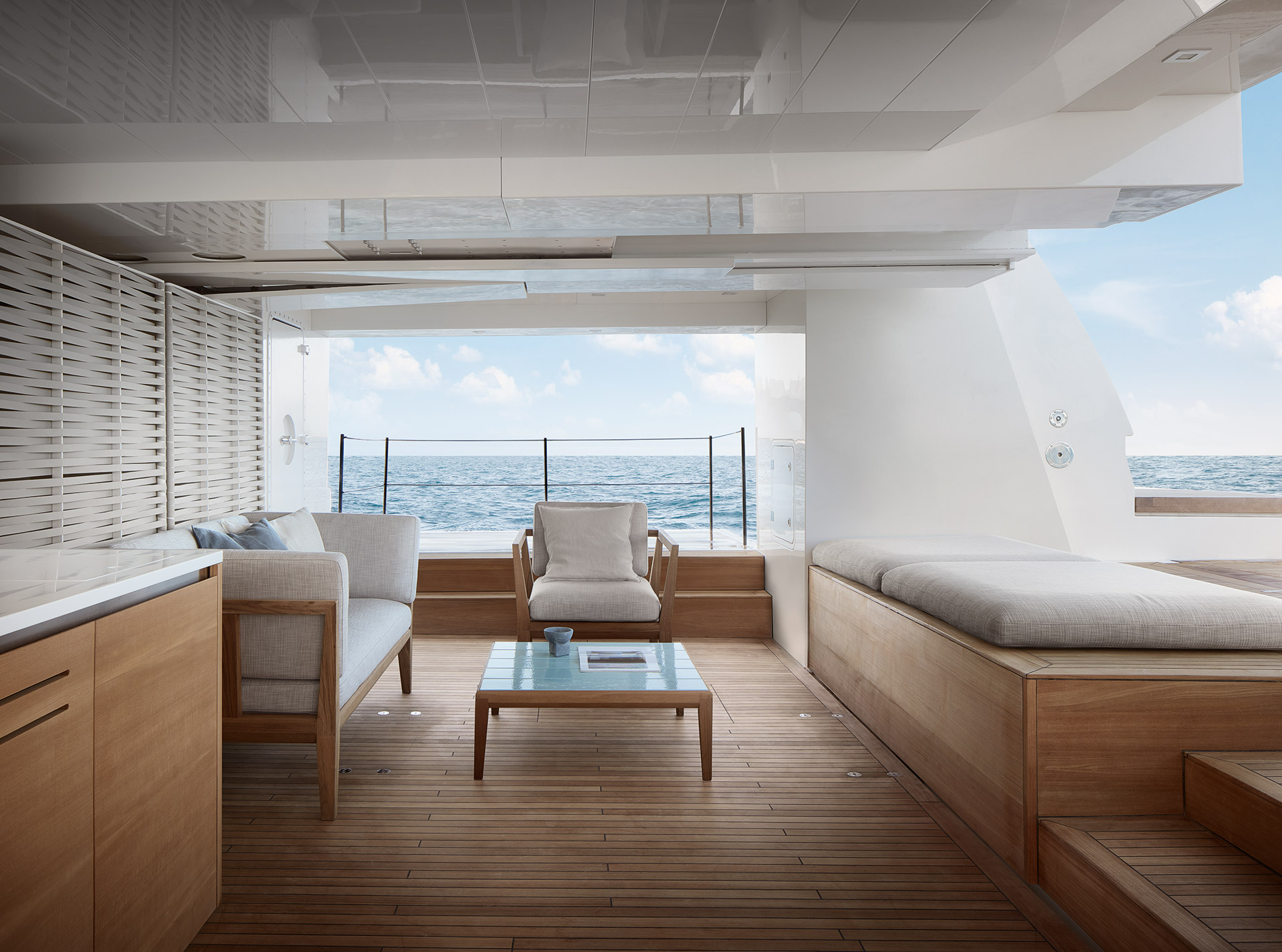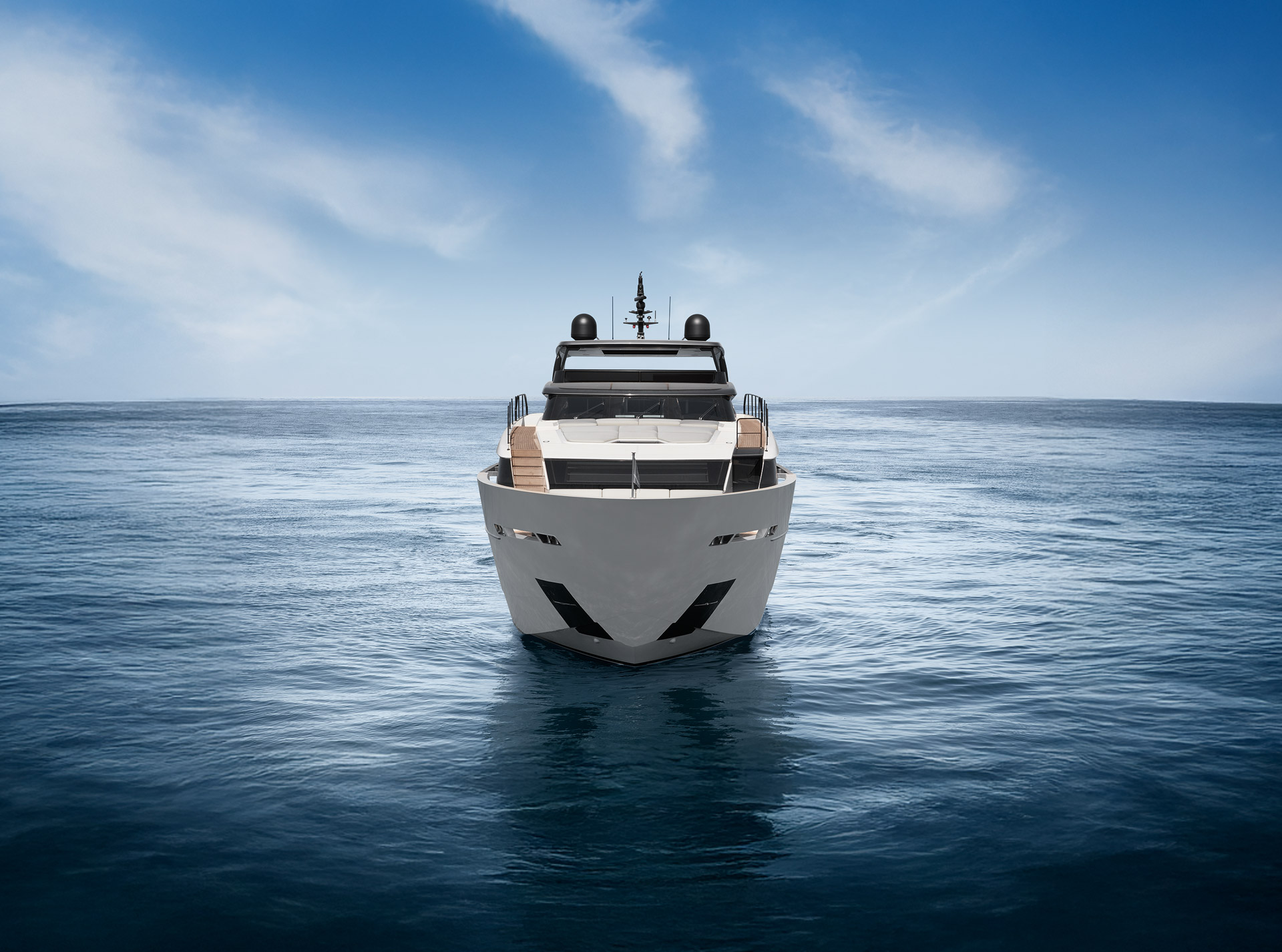The SL120A exterior elevates asymmetry to its fullest expression, dissolving boundaries between inside and out. Sliding glass, lowered bulwarks and sculpted volumes create fluid circulation, panoramic sea views and expansive outdoor living.
