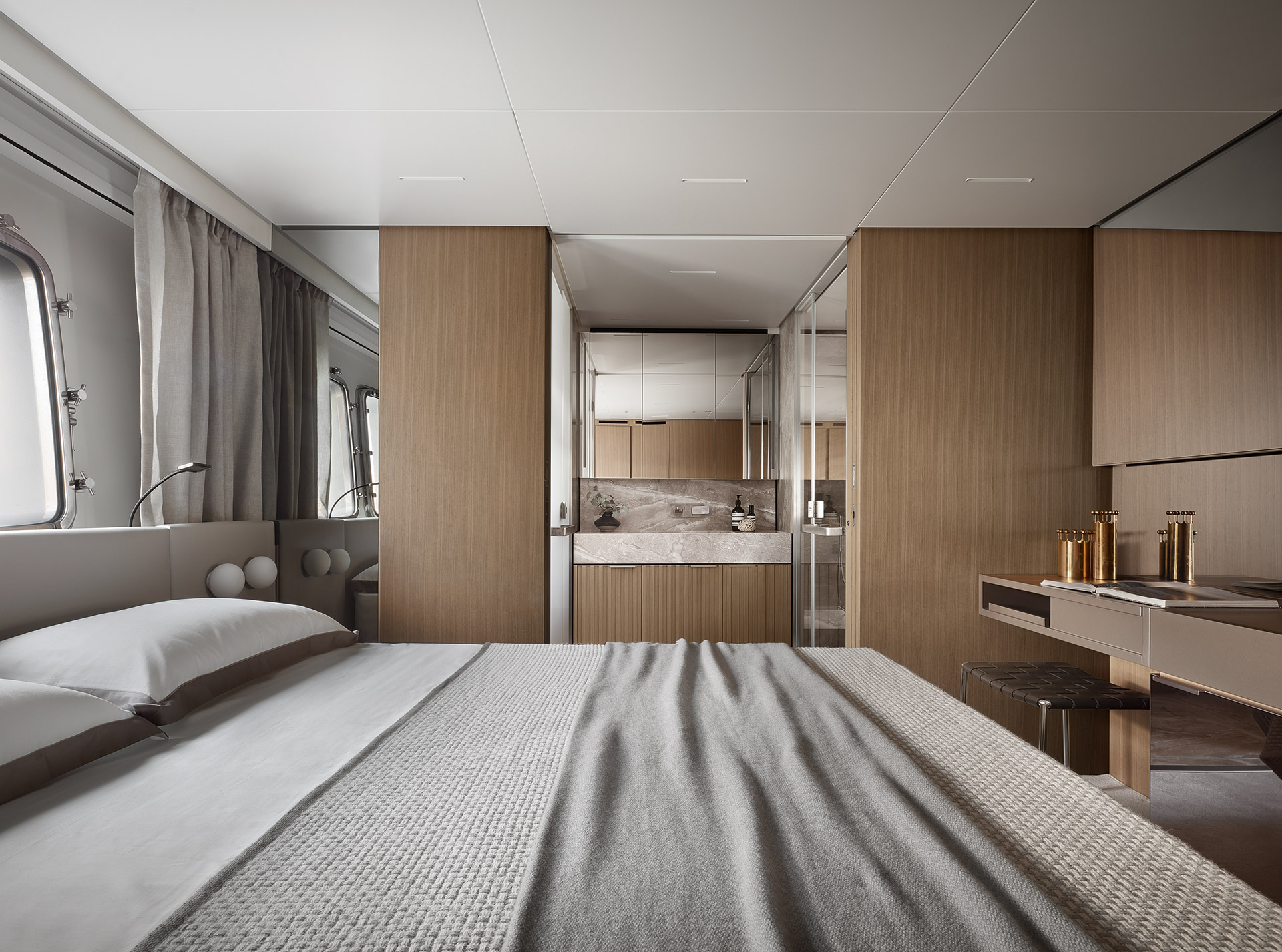 The interiors embrace lightness and harmony, with a full-beam owner’s suite and flexible living spaces. Neutral tones, walnut finishes and refined detailing create a calm, marine atmosphere of understated elegance.