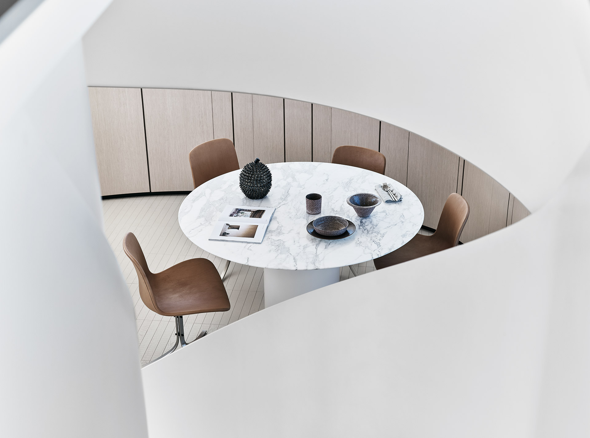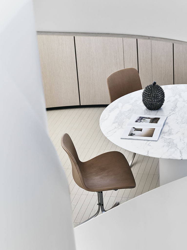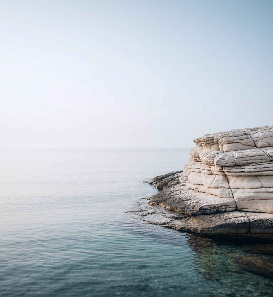 Surrounded by natural light, the interiors unfold as a continuous open space, where refined materials, soft tones and architectural clarity create a calm, residential atmosphere in seamless dialogue with the sea.