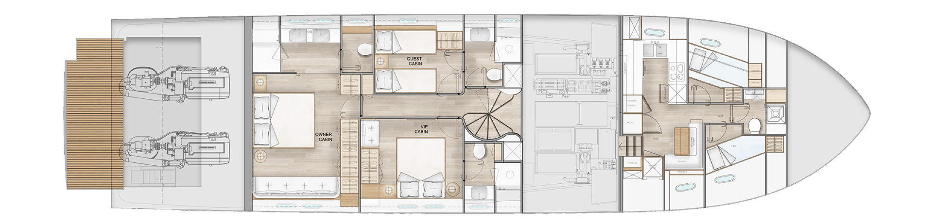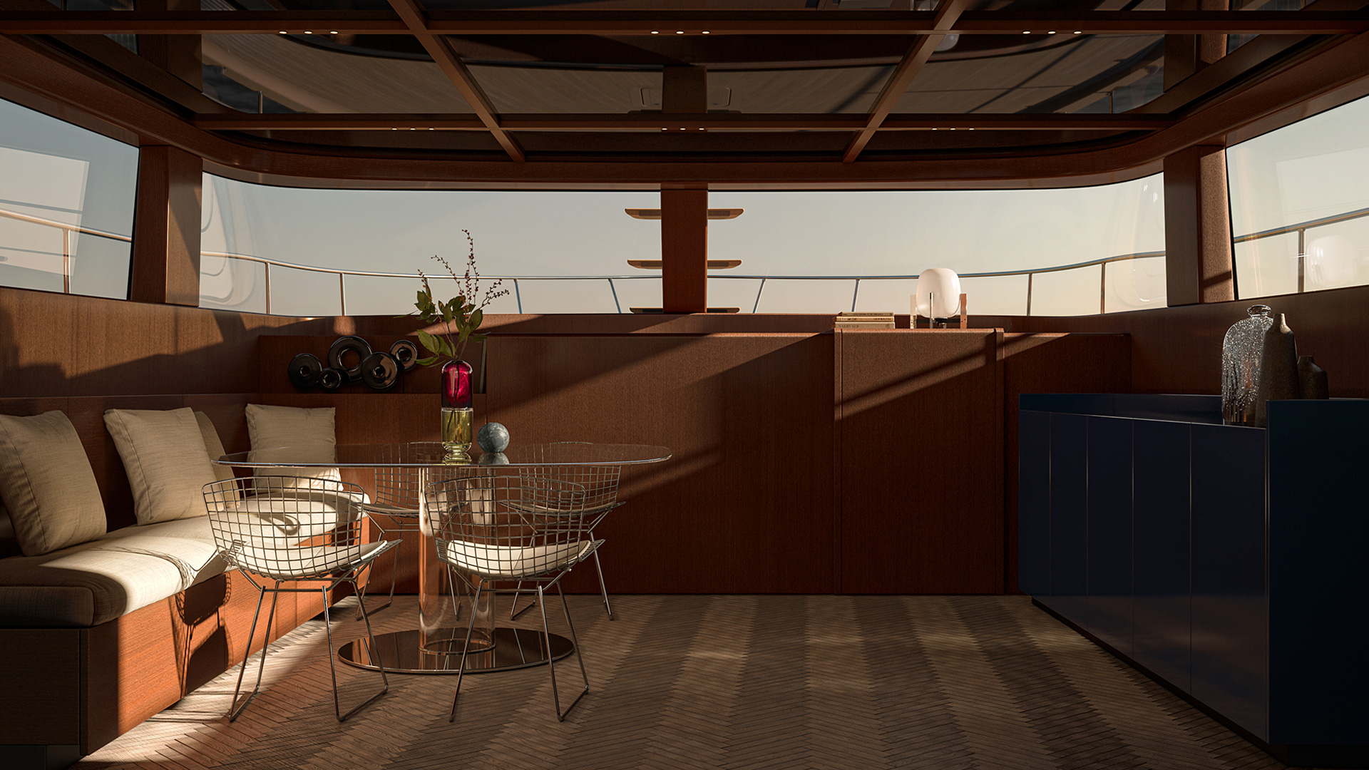 SHE reinterprets the stylistic codes of great classics of Italian yachting with a contemporary sensibility. The carefully coordinated interior design reflects this dual soul — both perpetual and modern.