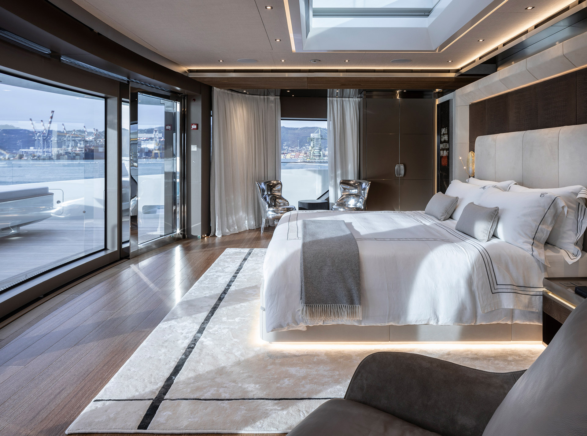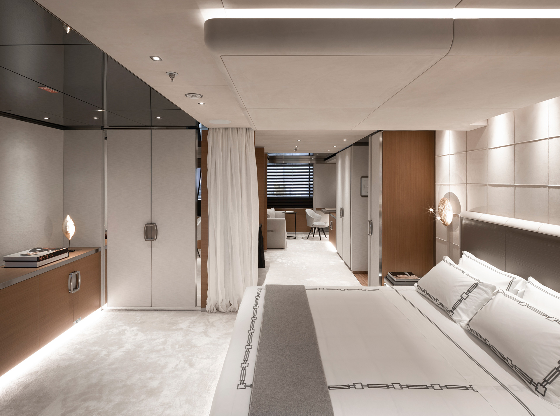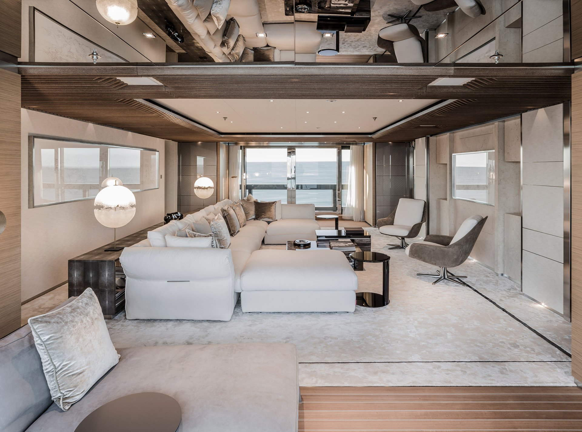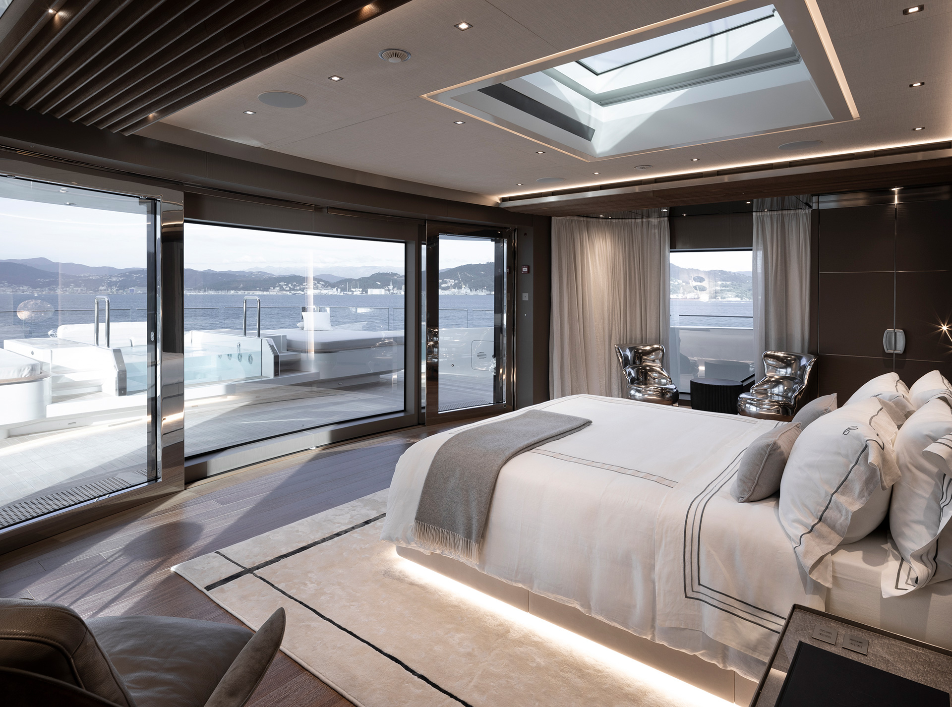 Gli interni, di Francesco Paszkowski e Margherita Casprini, offrono ampie cabine, ponti panoramici e spazi vivibili personalizzati. Dettagli accurati e ampie vetrate creano serenità, privacy e comodità intramontabile.