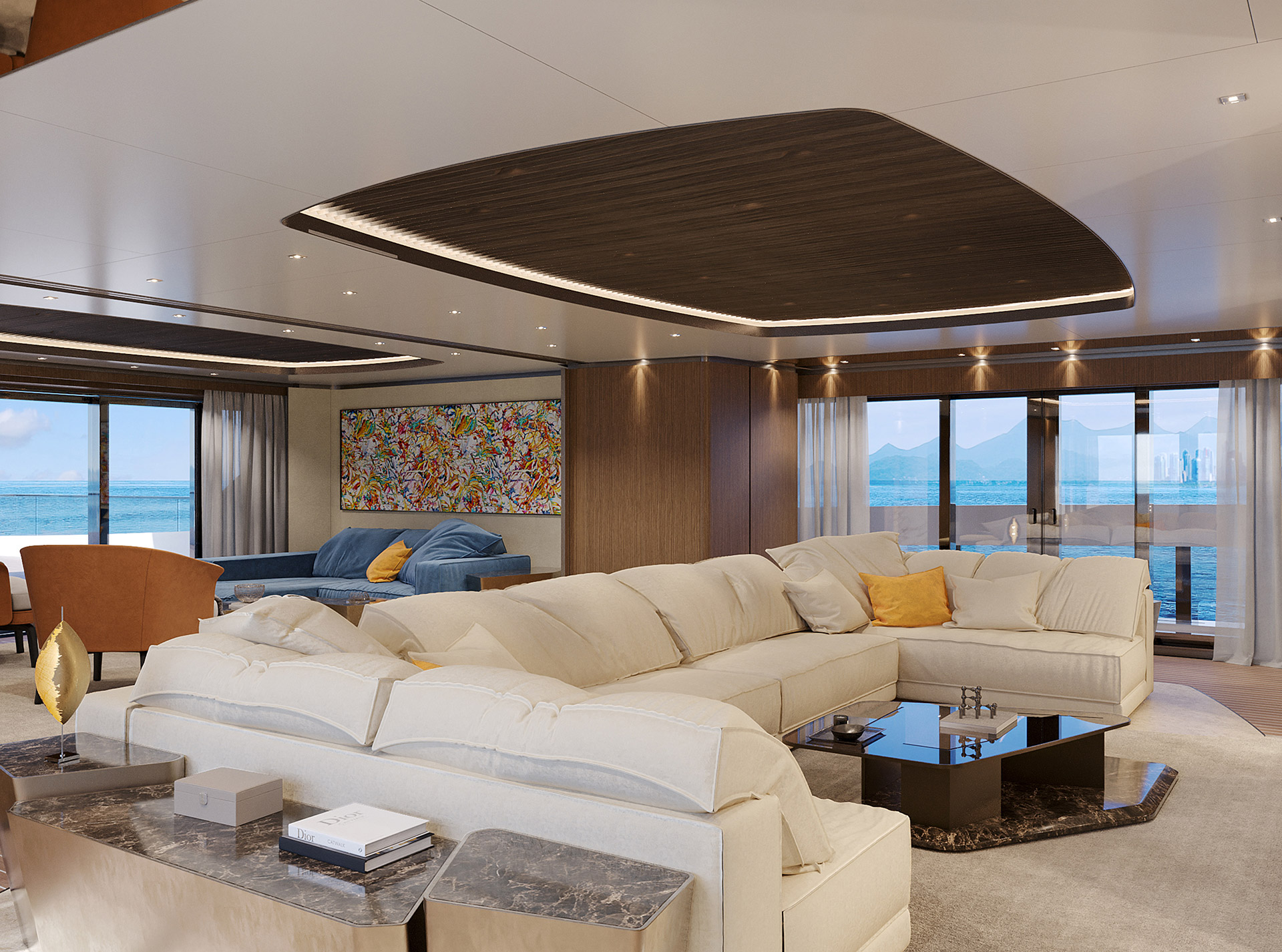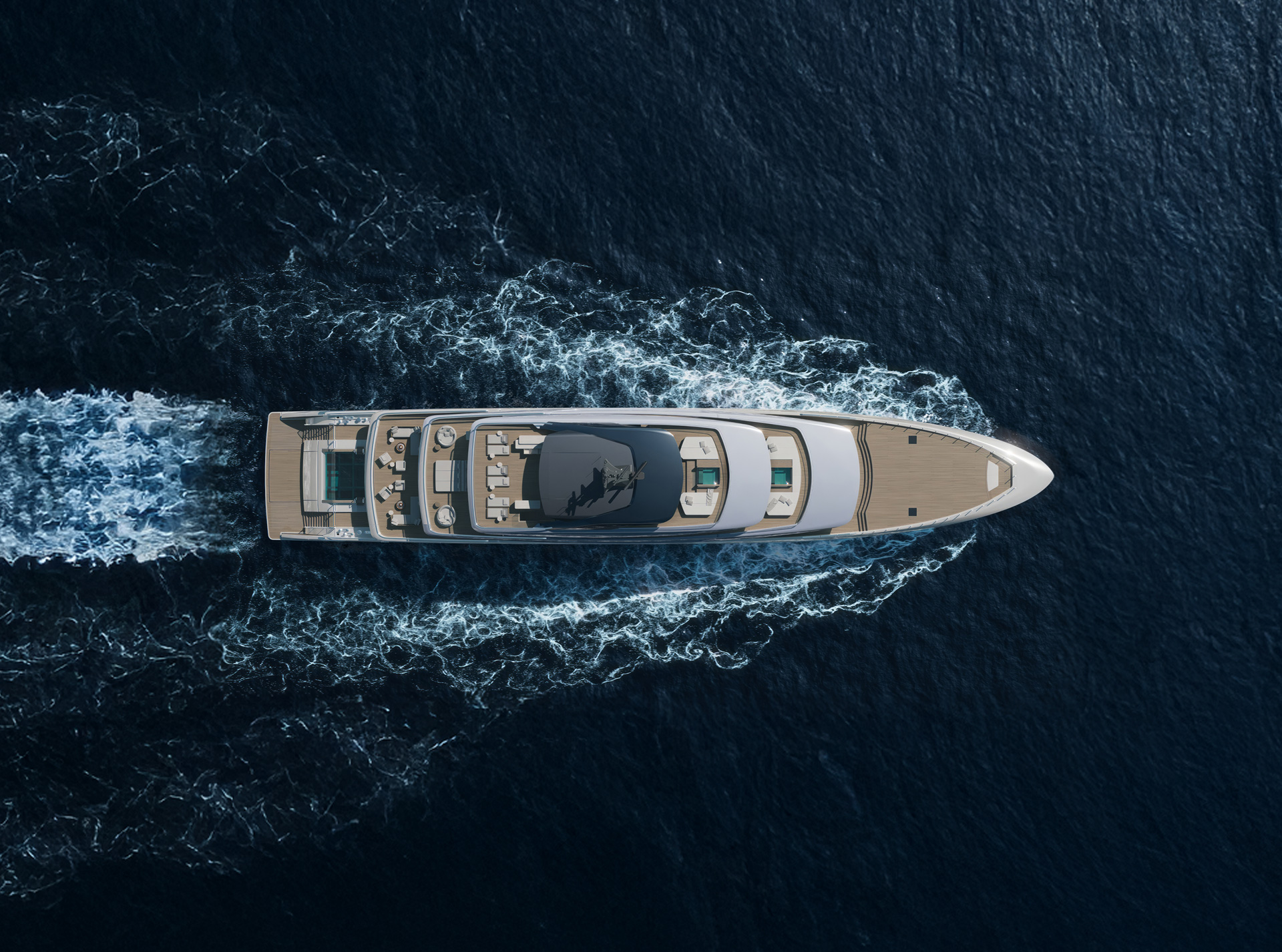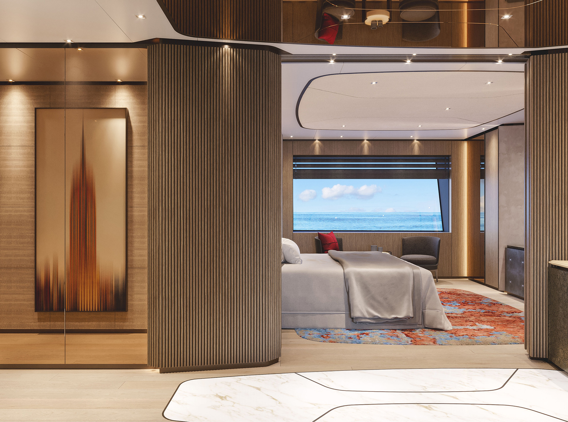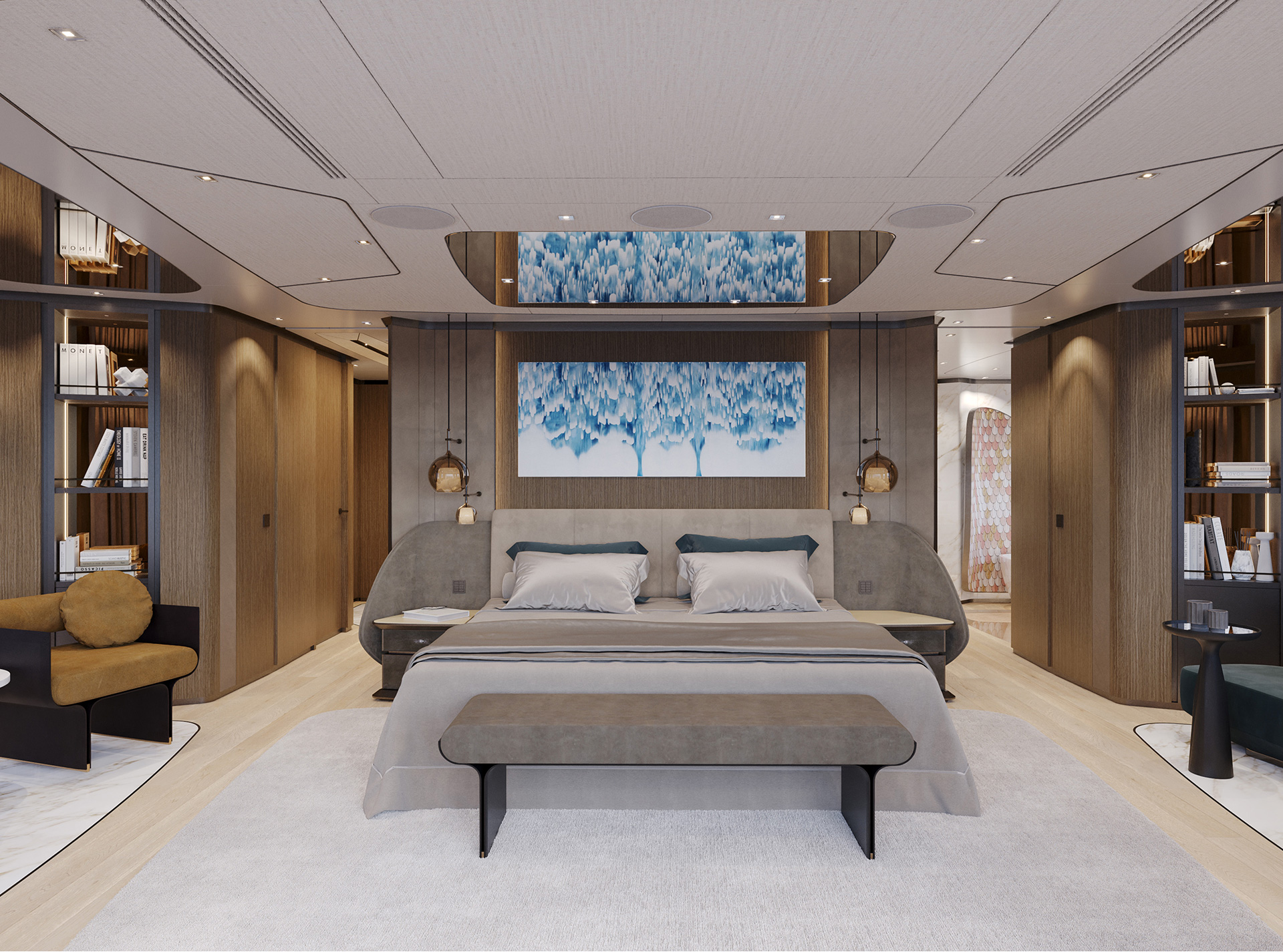 Curve morbide, legni opachi e marmi pregiati creano un ambiente sereno e sofisticato, caratterizzato da confortevoli zone giorno, uno spazio privato per l'armatore e un'area benessere.