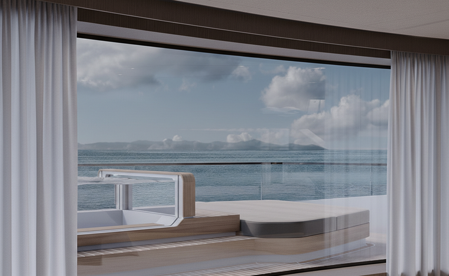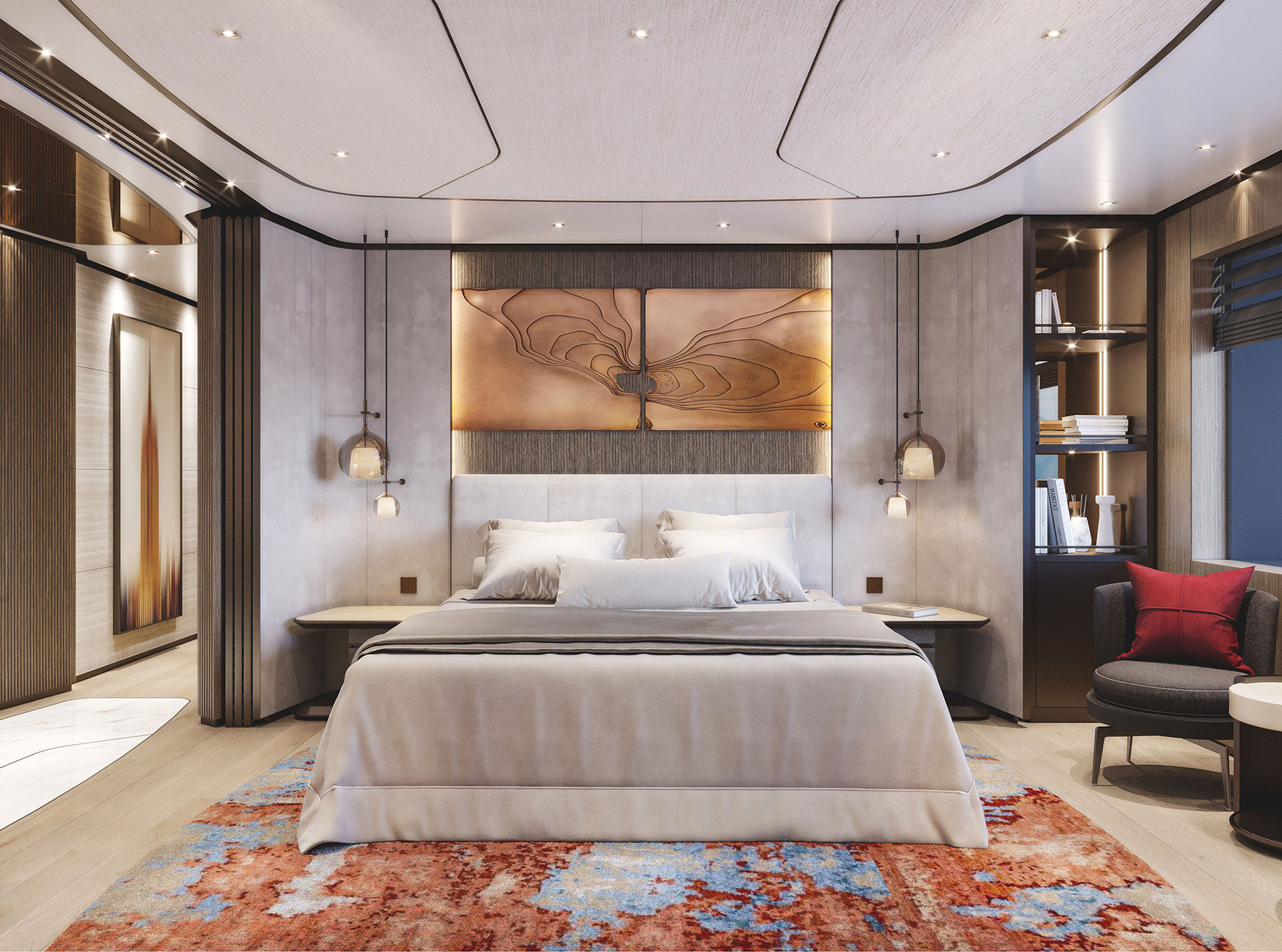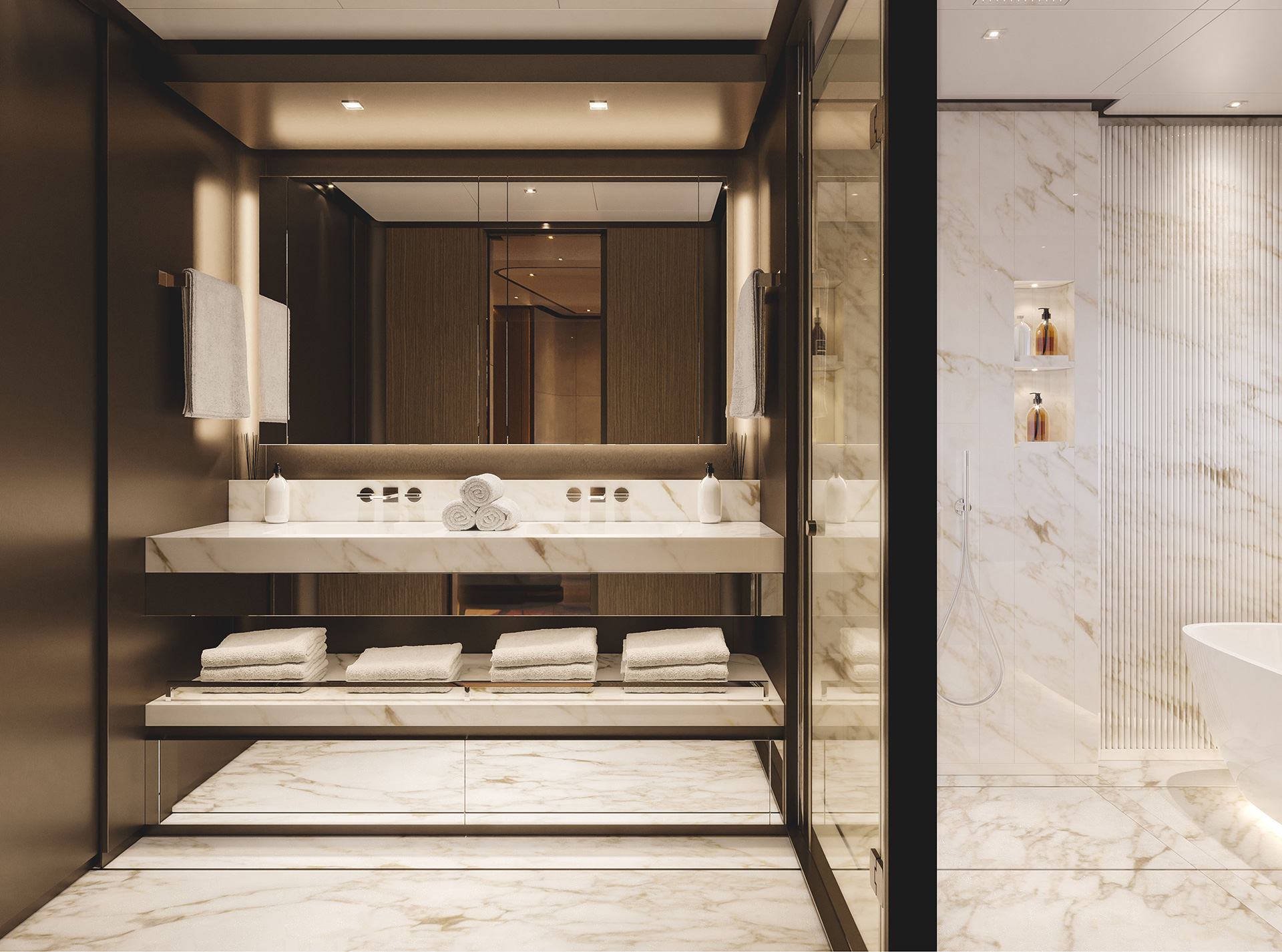 Curve morbide, legni opachi e marmi pregiati creano un ambiente sereno e sofisticato, caratterizzato da confortevoli zone giorno, uno spazio privato per l'armatore e un'area benessere.