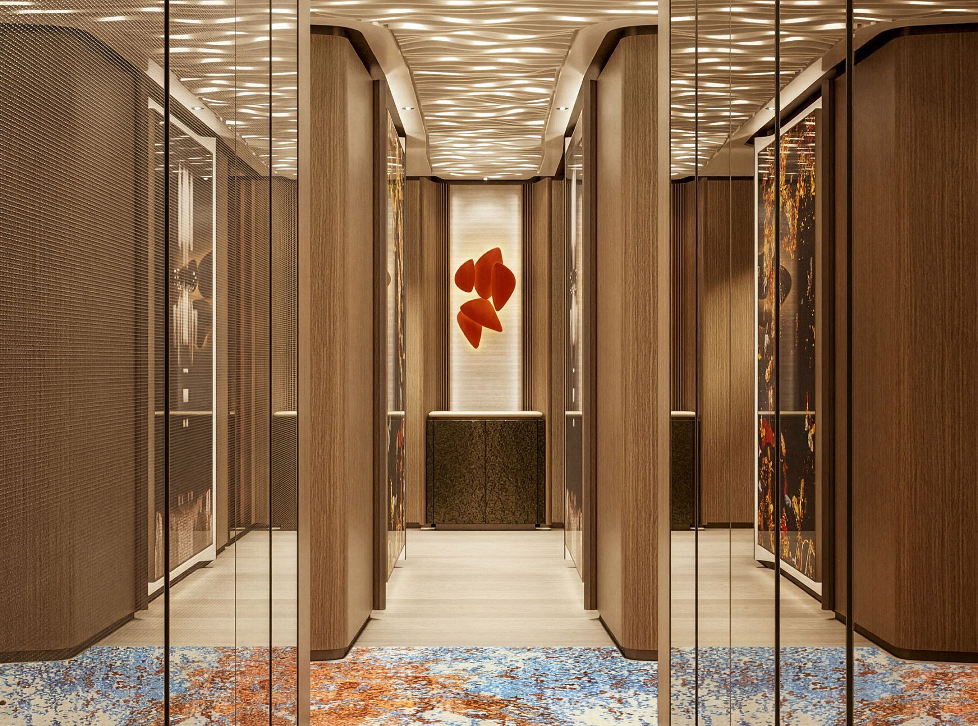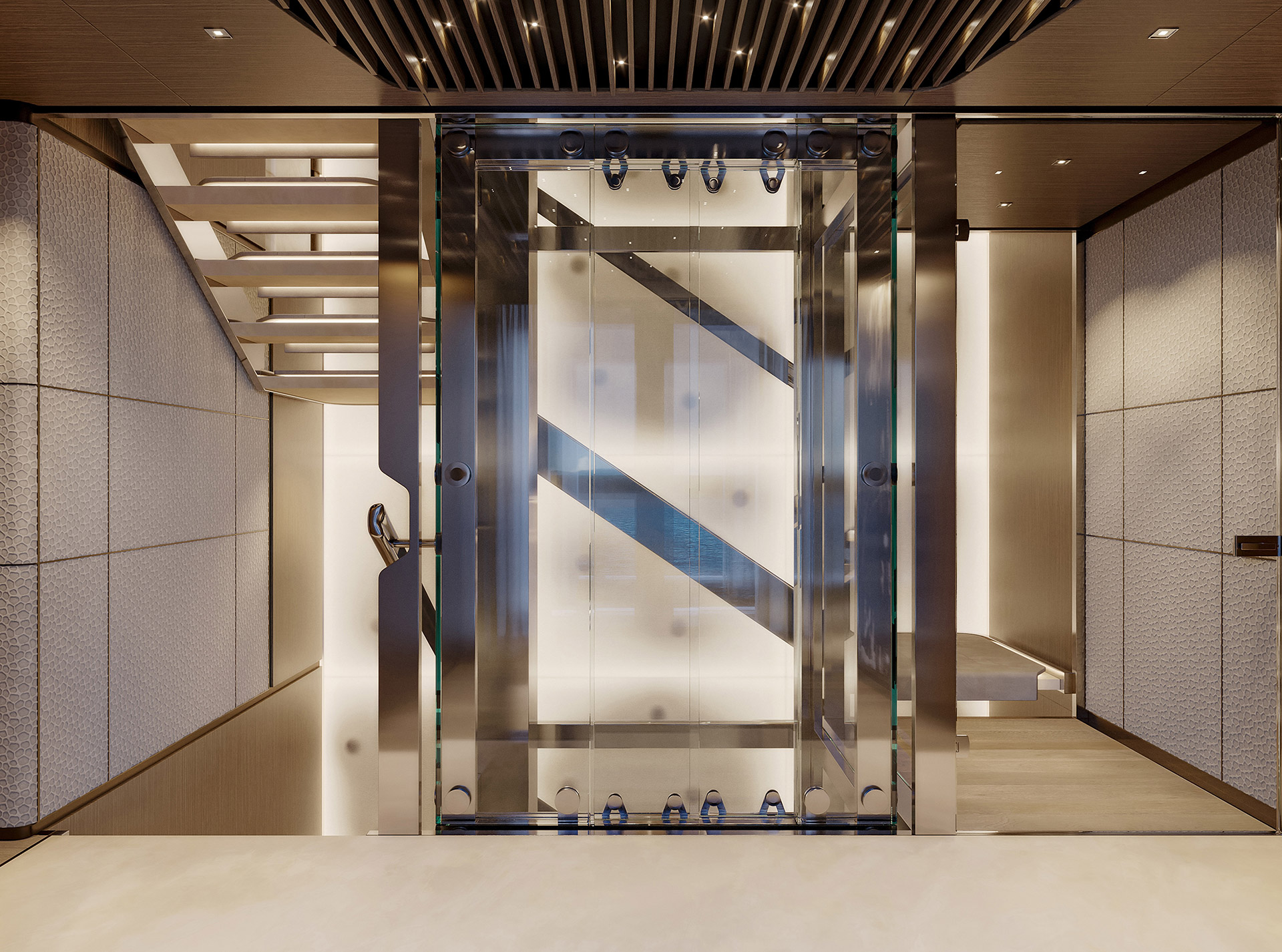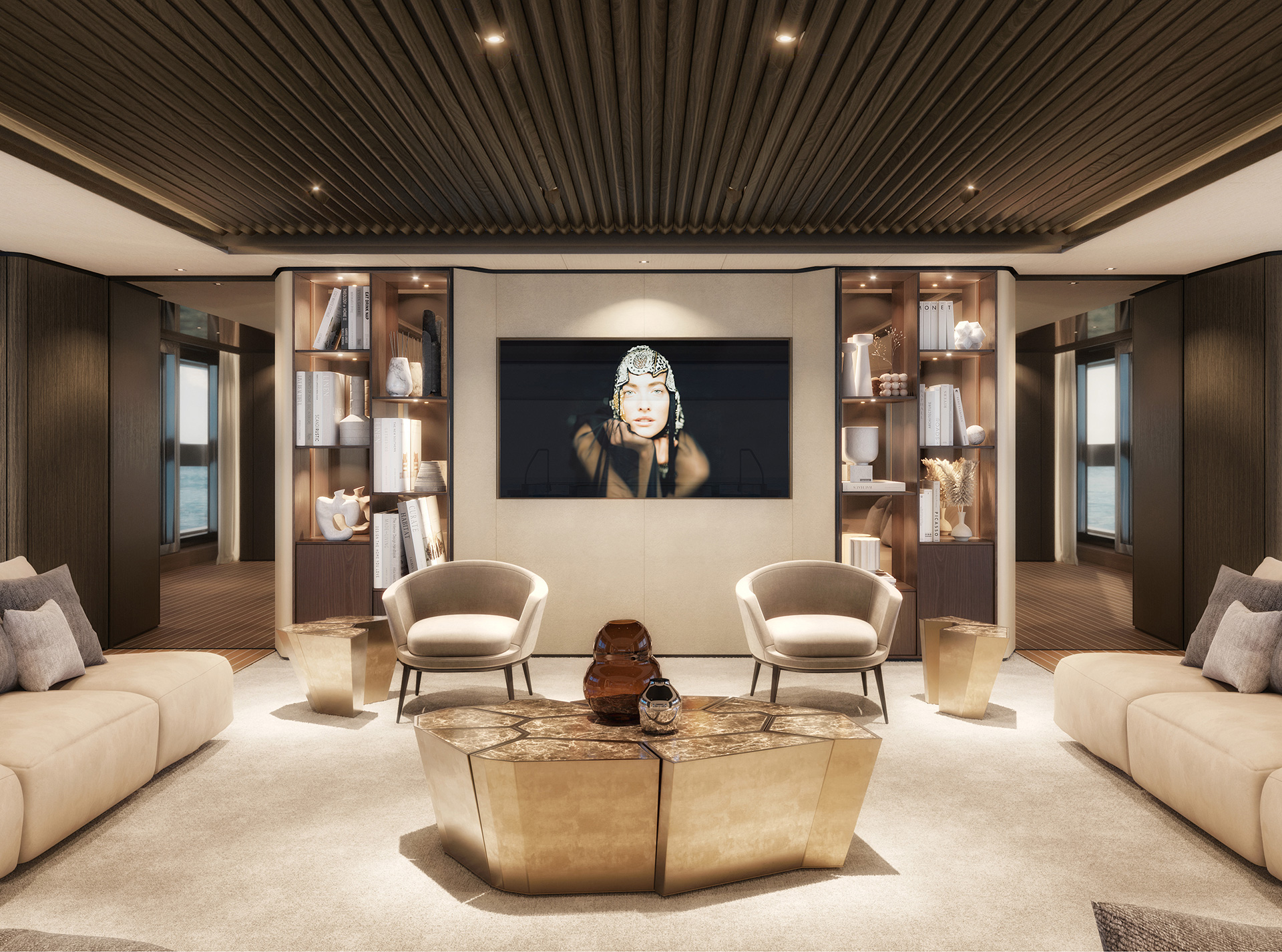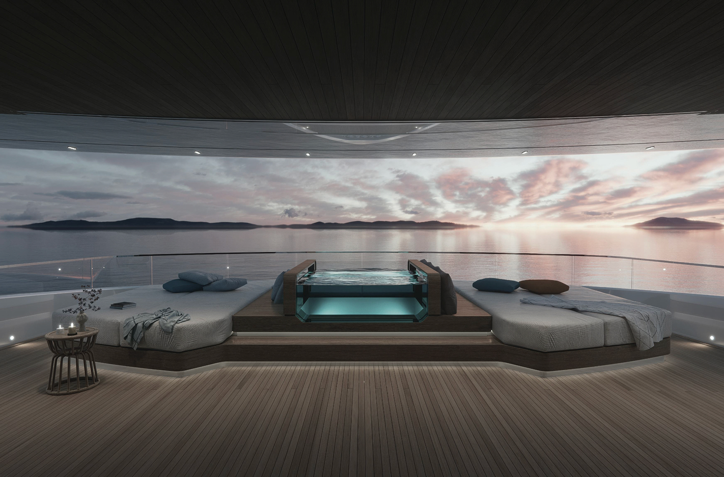 Curve morbide, legni opachi e marmi pregiati creano un ambiente sereno e sofisticato, caratterizzato da confortevoli zone giorno, uno spazio privato per l'armatore e un'area benessere.