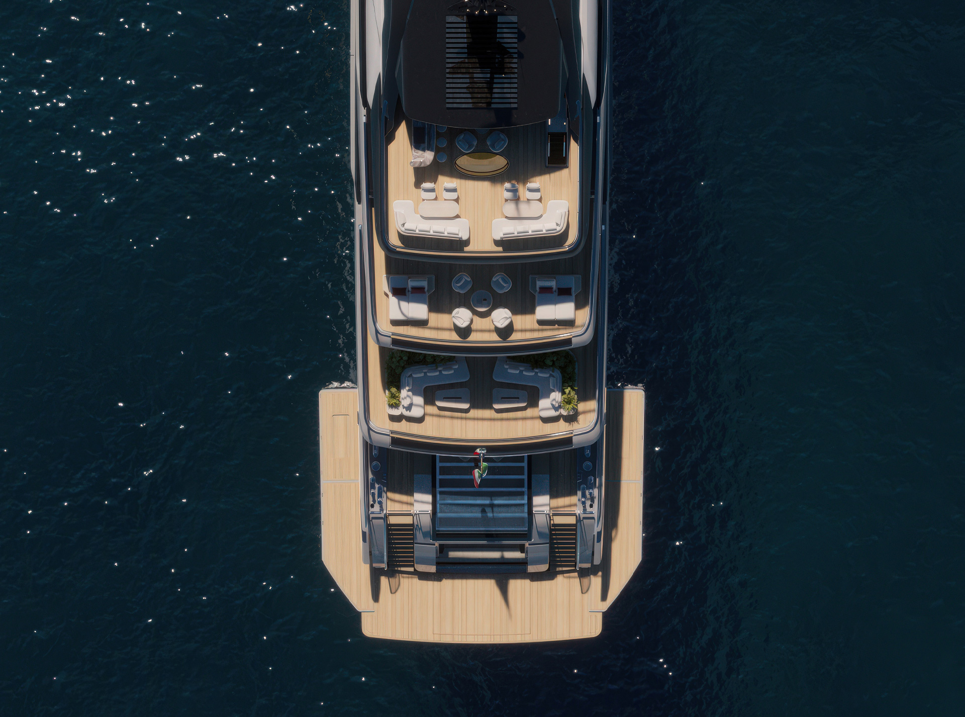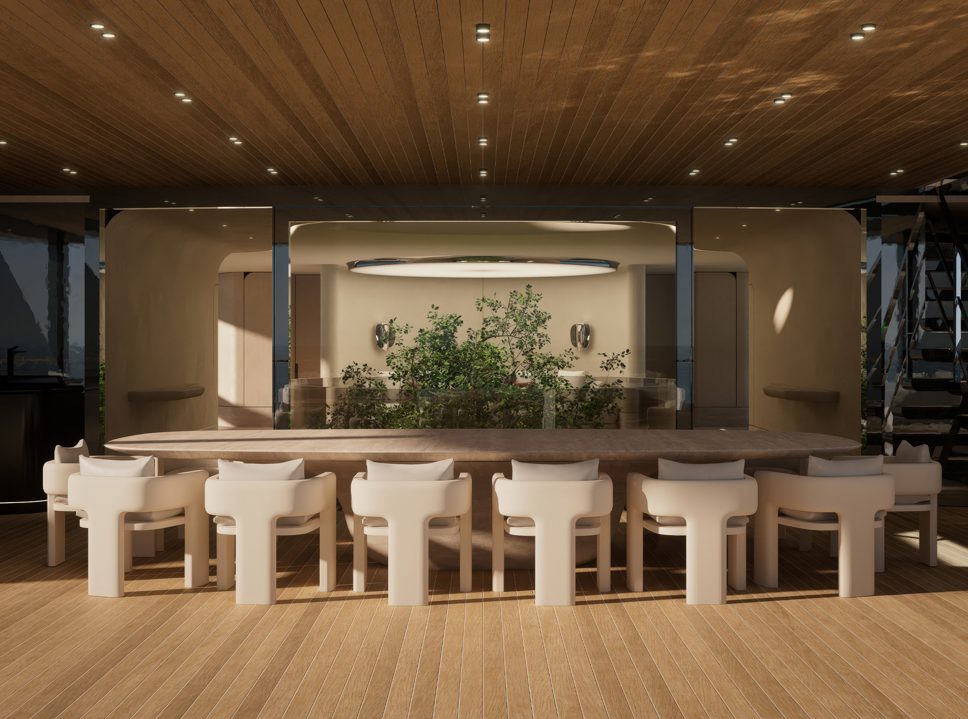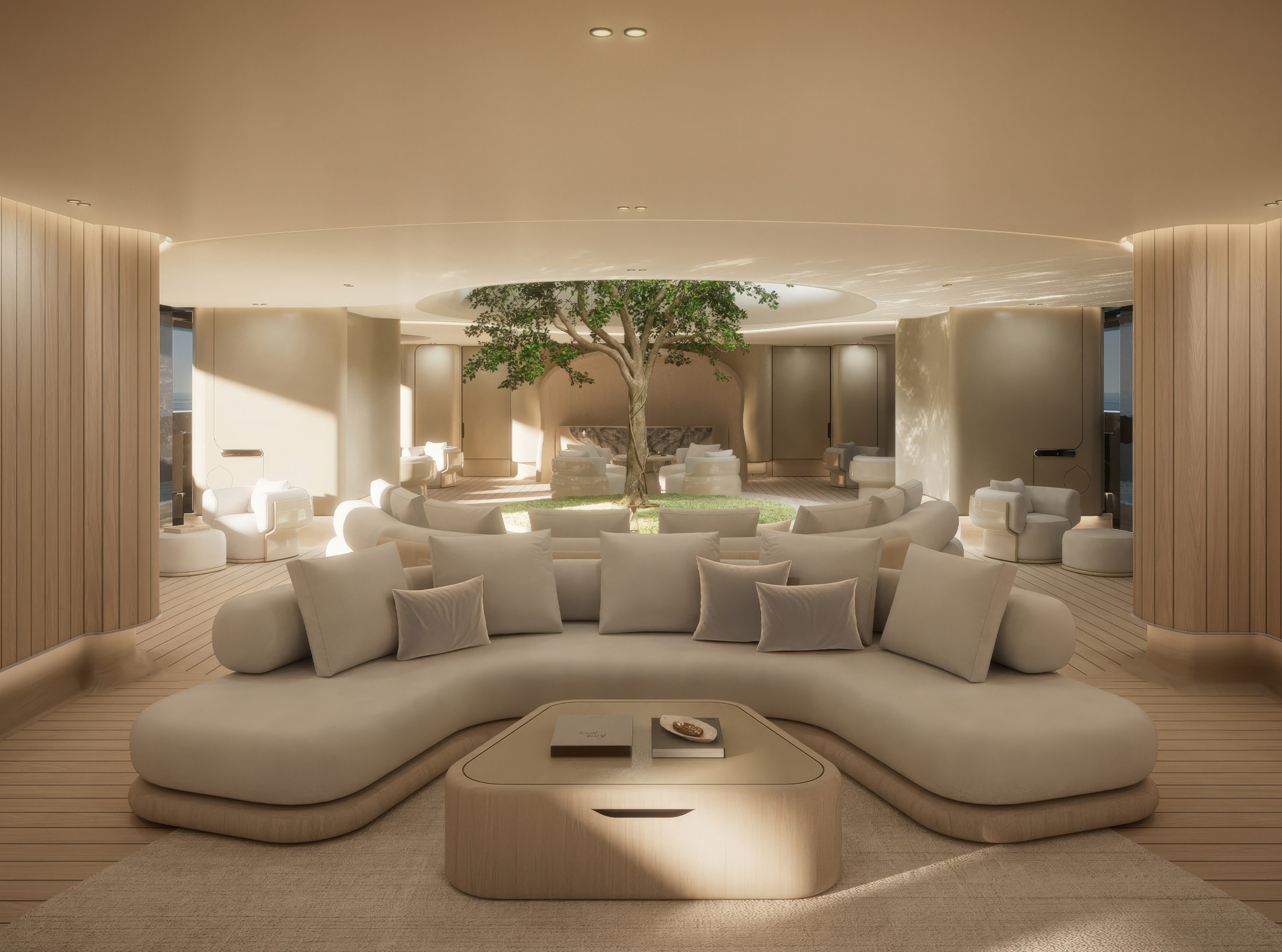 La configurazione degli spazi definisce un continuum progettuale: l’Ocean Resort come piattaforma modulare sul mare, il Main Deck come nodo verticale attorno al Ficus, mentre i ponti superiori integrano funzioni, materiali e aperture in un’unica strategia di design coerente.
