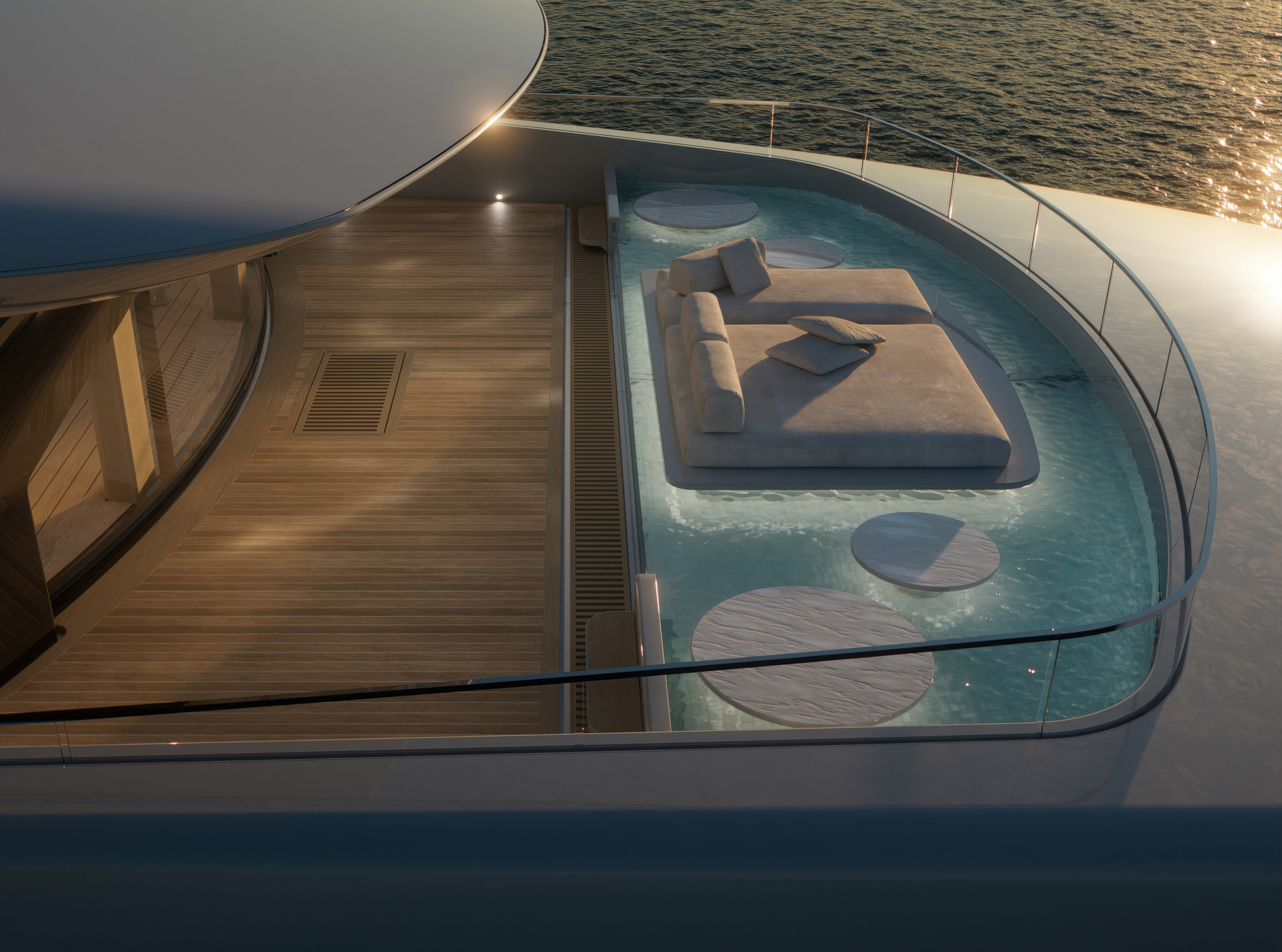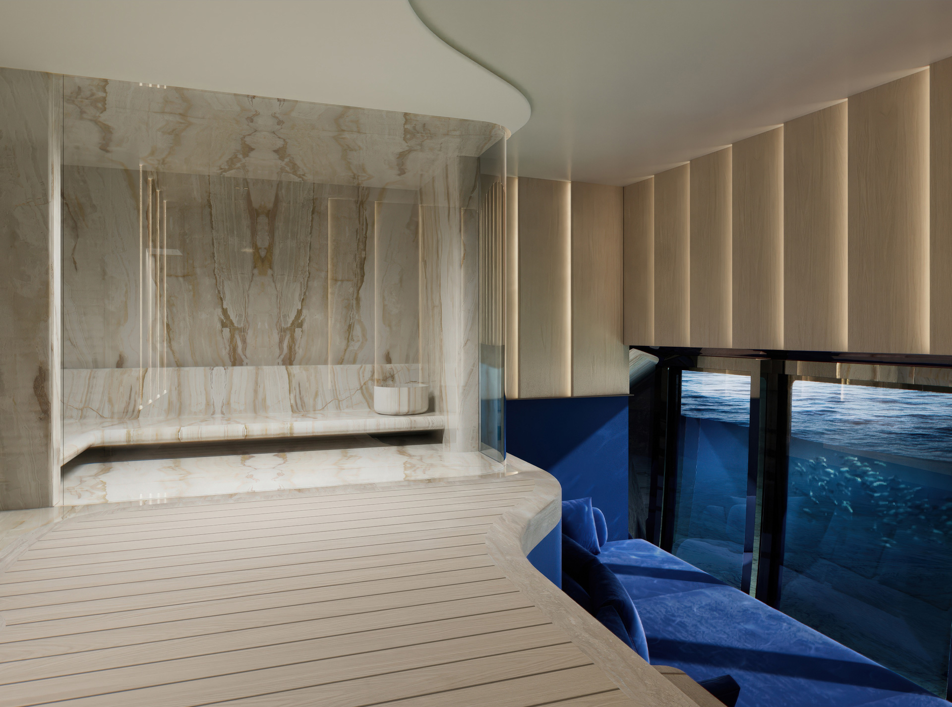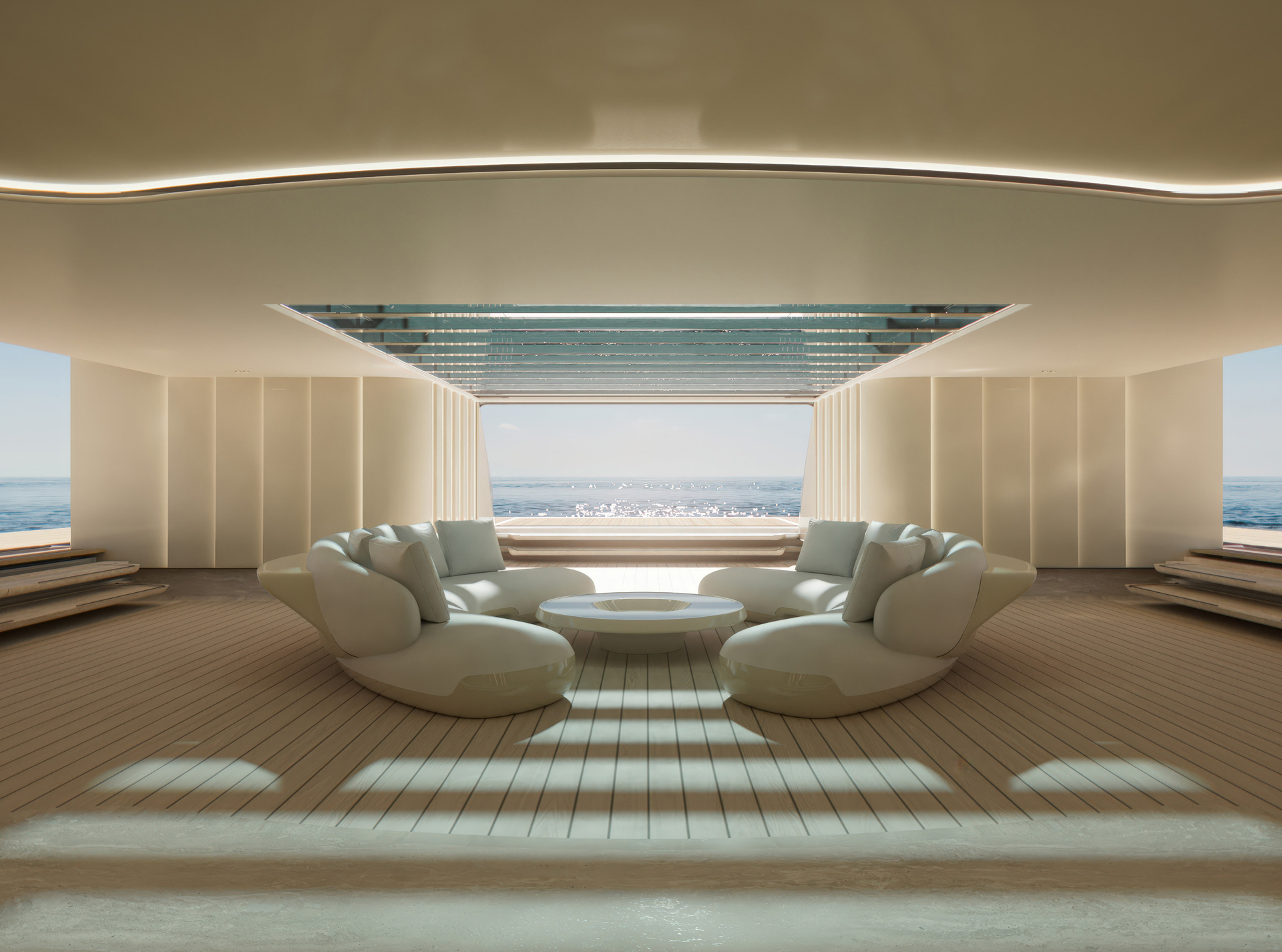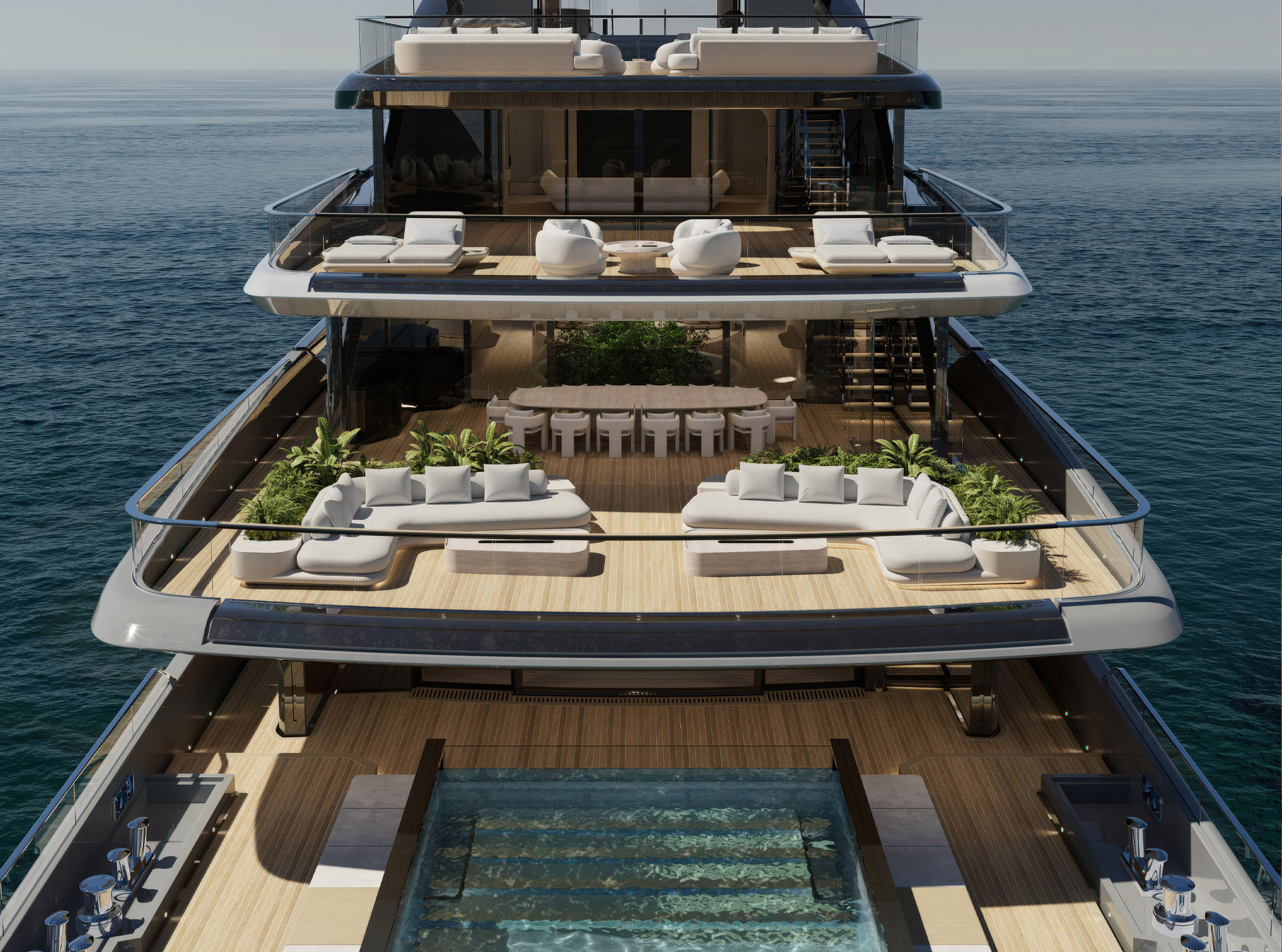 La configurazione degli spazi definisce un continuum progettuale: l’Ocean Resort come piattaforma modulare sul mare, il Main Deck come nodo verticale attorno al Ficus, mentre i ponti superiori integrano funzioni, materiali e aperture in un’unica strategia di design coerente.