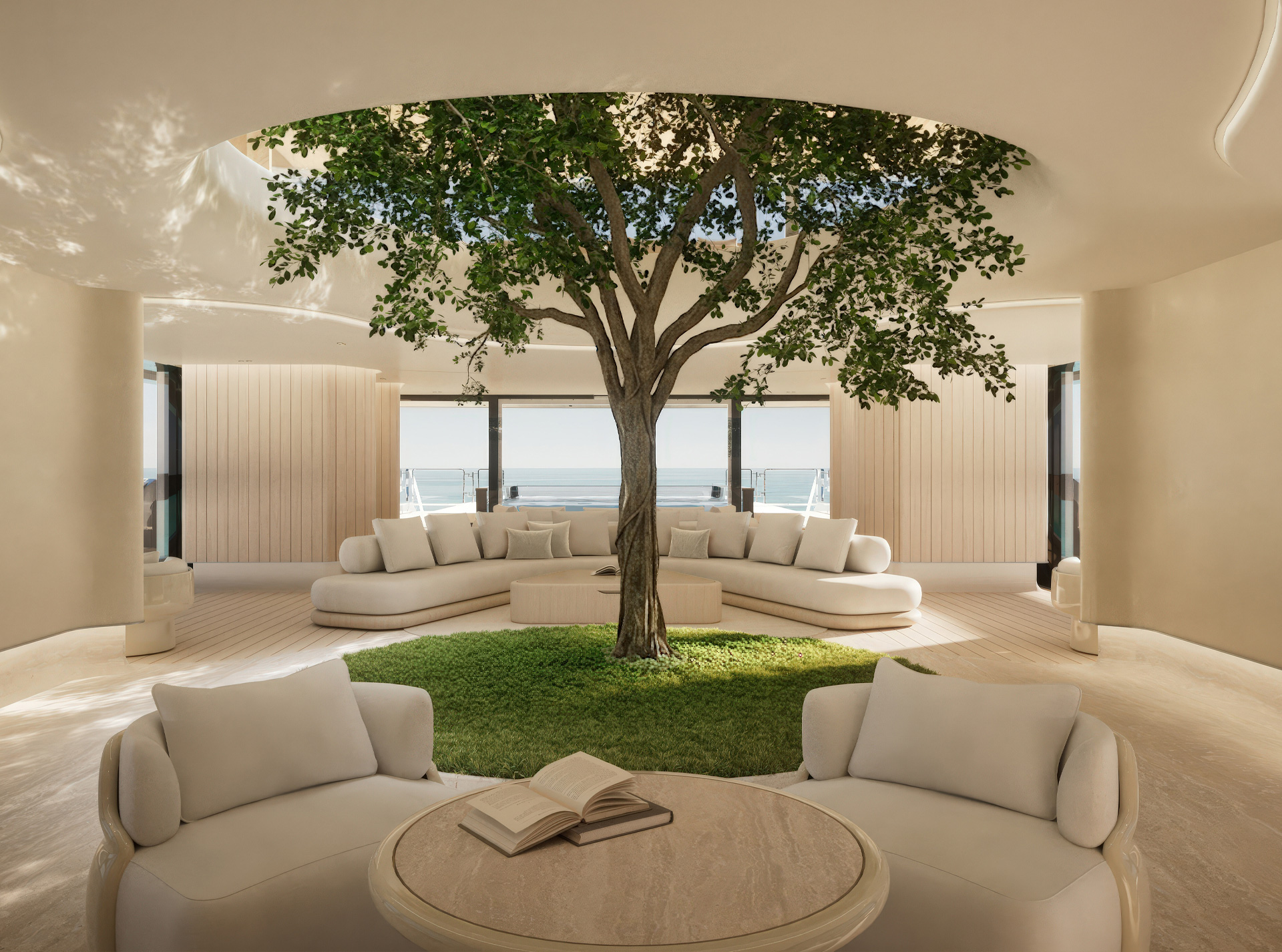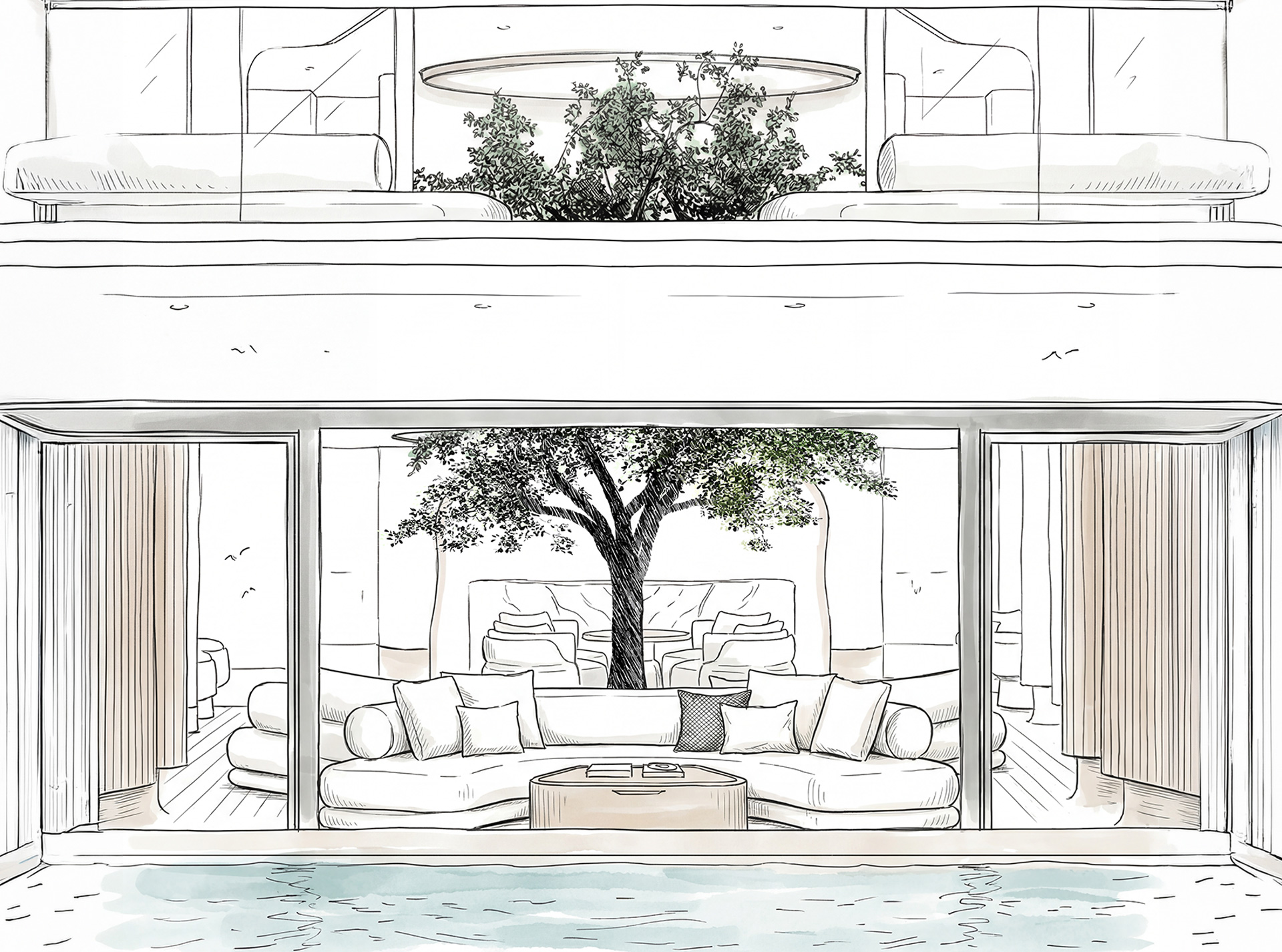 Una visione in cui natura, struttura e luce convergono: il Ficus come architettura, il mare come presenza, l’acqua come atmosfera. Ogni ambiente diventa esperienza sensoriale, equilibrio tra tecnica, vita e paesaggio.