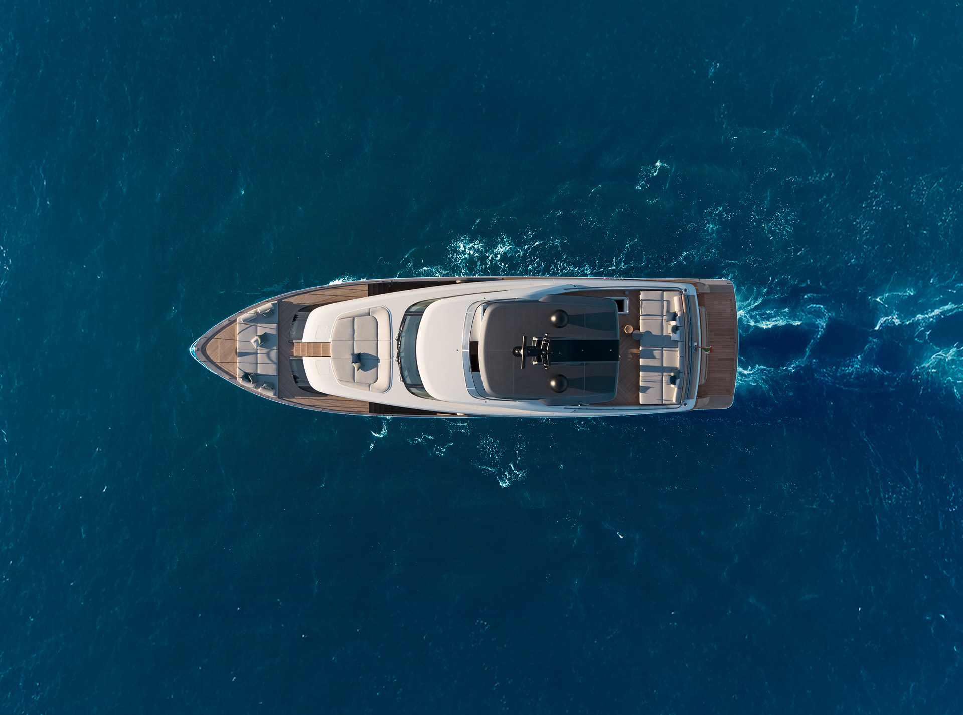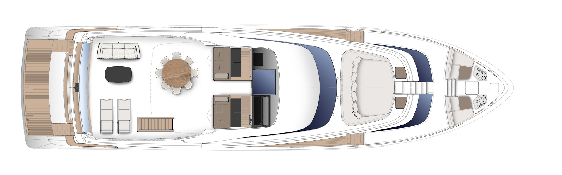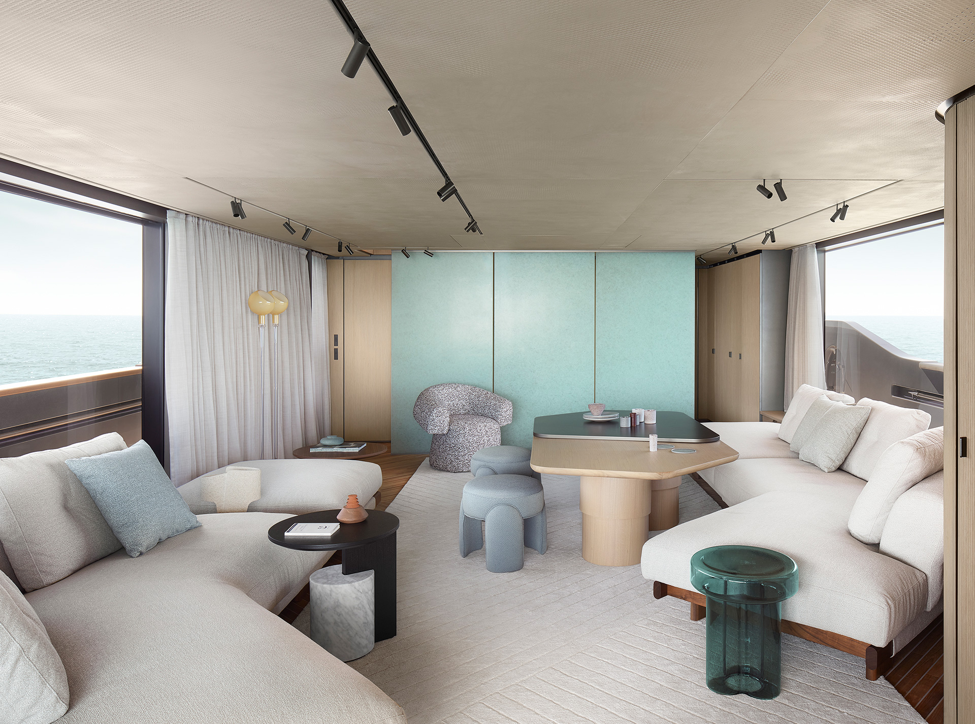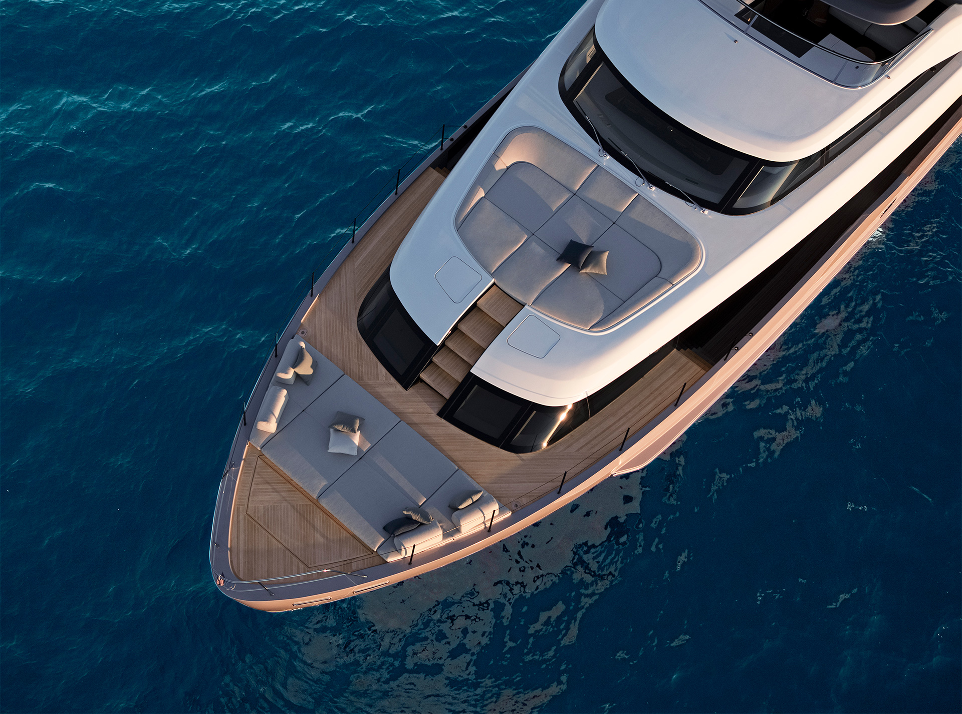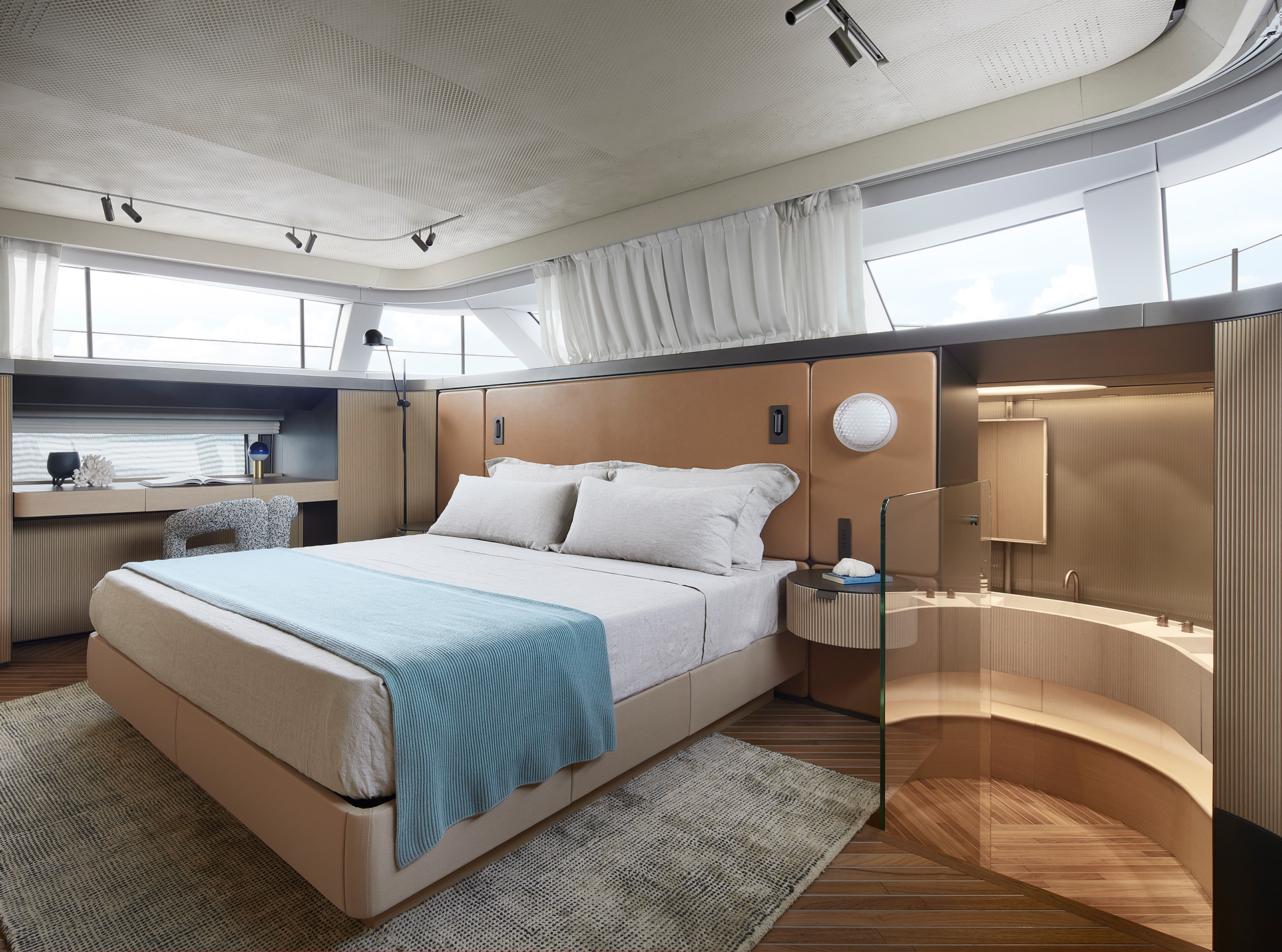 Gli interni creano un'atmosfera calma e tranquilla, unendo spazi comuni e privati attraverso grandi vetrate e passaggine ben studiati. Materiali raffinati e layouts su misura, ampliano il comfort, la chiarezza degli spazi e la naturale fluidità tra la vita esterna e interna in mare.