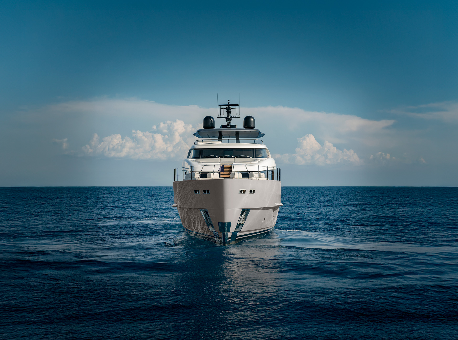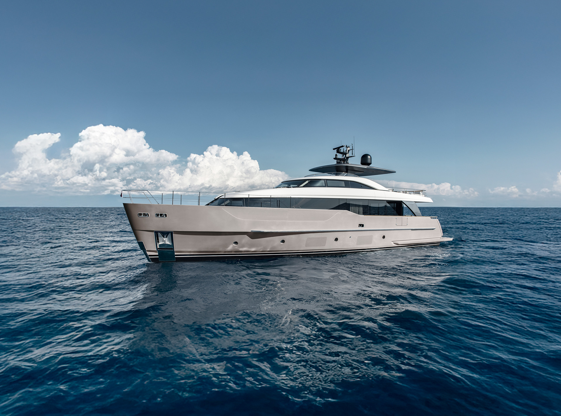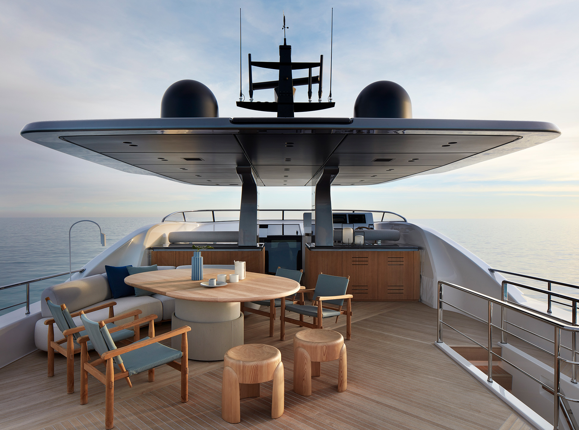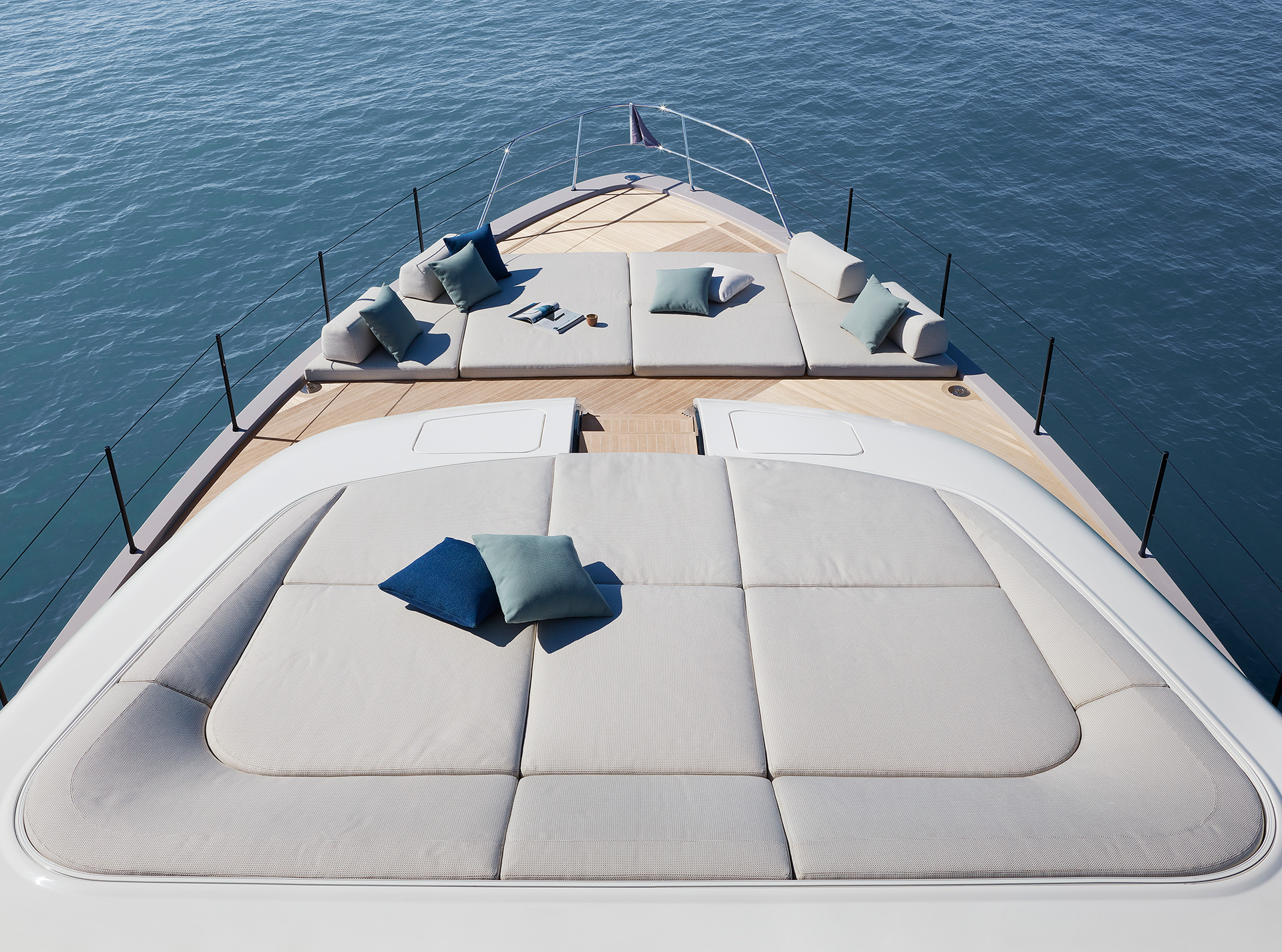 Gli interni creano un'atmosfera calma e tranquilla, unendo spazi comuni e privati attraverso grandi vetrate e passaggine ben studiati. Materiali raffinati e layouts su misura, ampliano il comfort, la chiarezza degli spazi e la naturale fluidità tra la vita esterna e interna in mare.