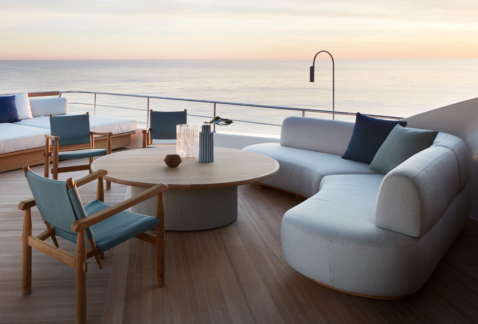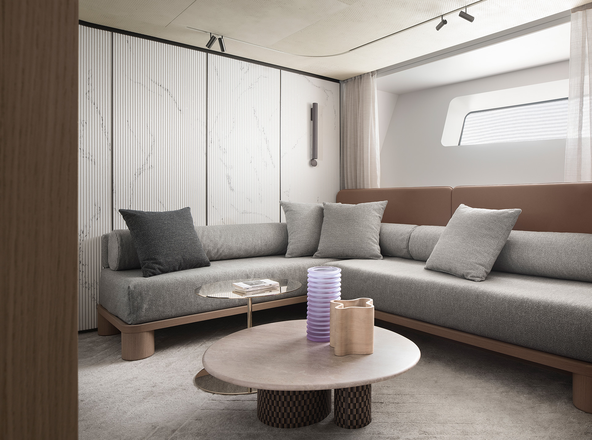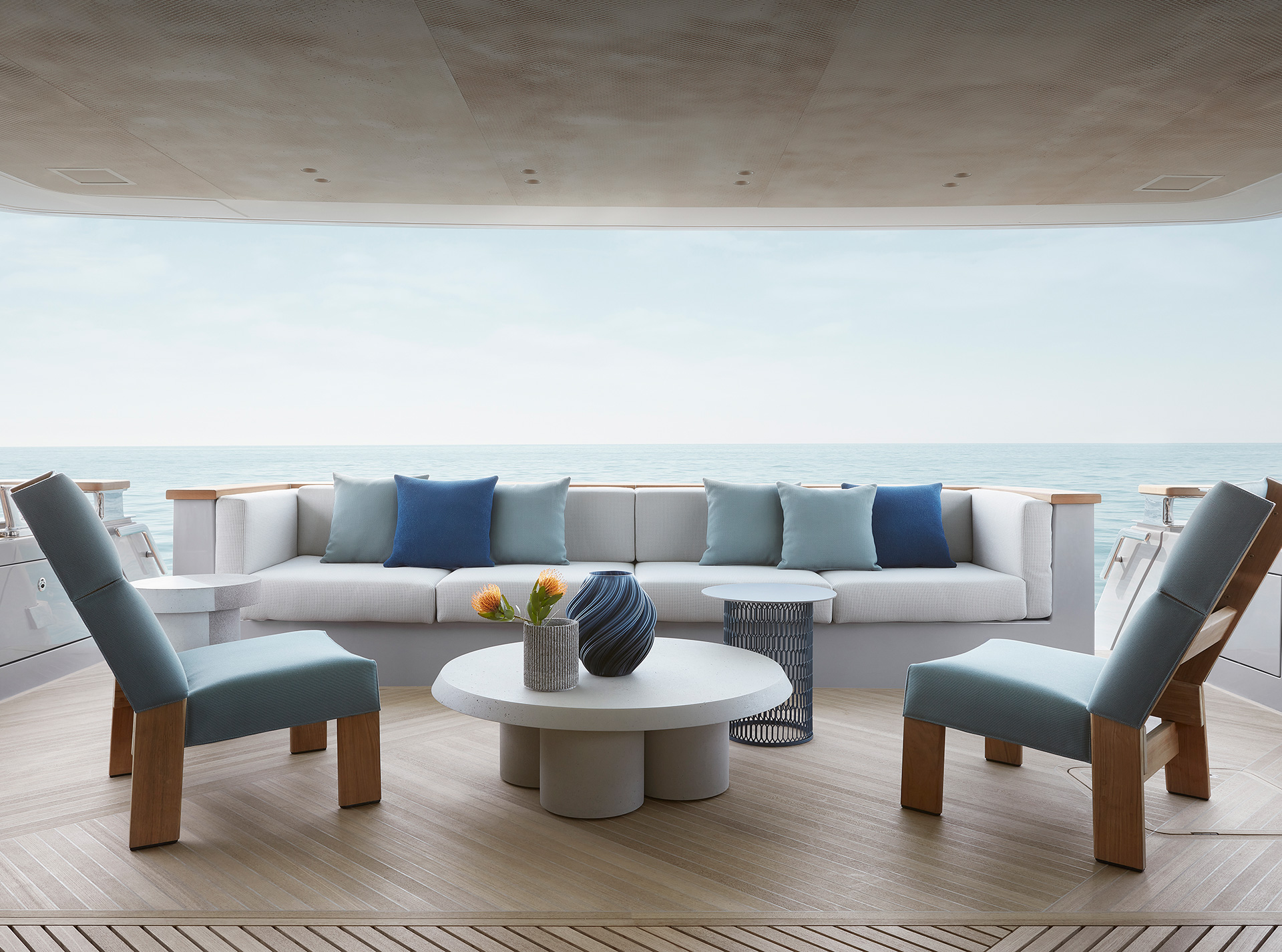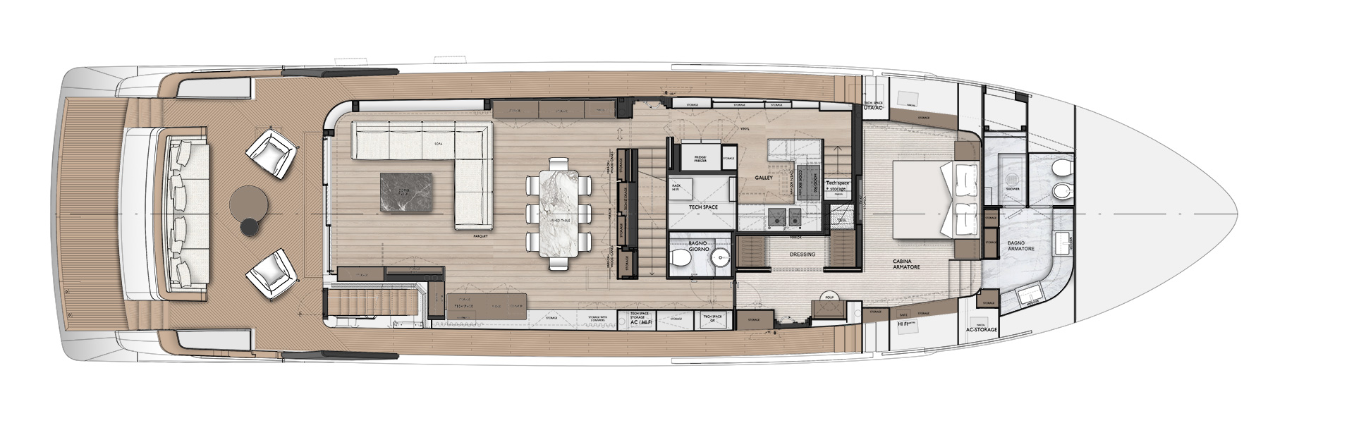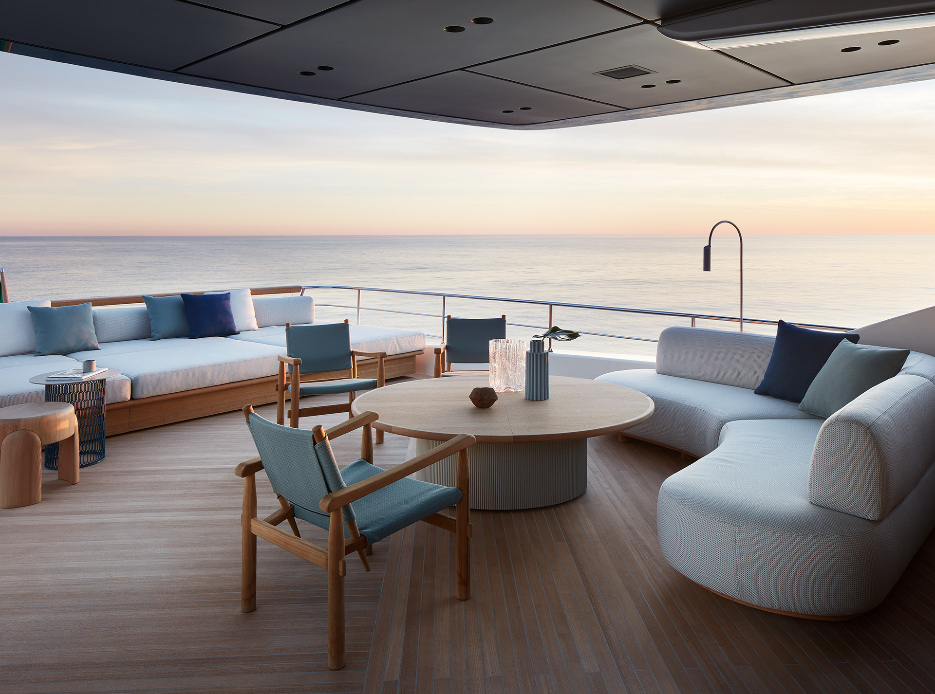 Gli interni creano un'atmosfera calma e tranquilla, unendo spazi comuni e privati attraverso grandi vetrate e passaggine ben studiati. Materiali raffinati e layouts su misura, ampliano il comfort, la chiarezza degli spazi e la naturale fluidità tra la vita esterna e interna in mare.