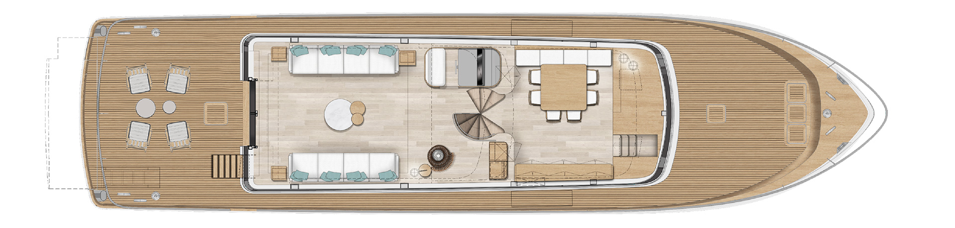 SHE reinterpreta i codici stilistici dei grandi classici della nautica italiana con una sensibilità contemporanea. Il design degli interni, curato con armonia in ogni dettaglio, riflette questa doppia anima, senza tempo e profondamente moderna.