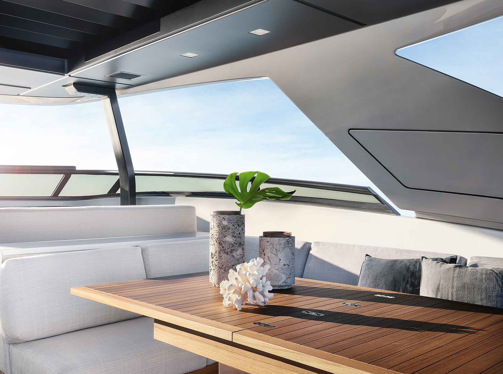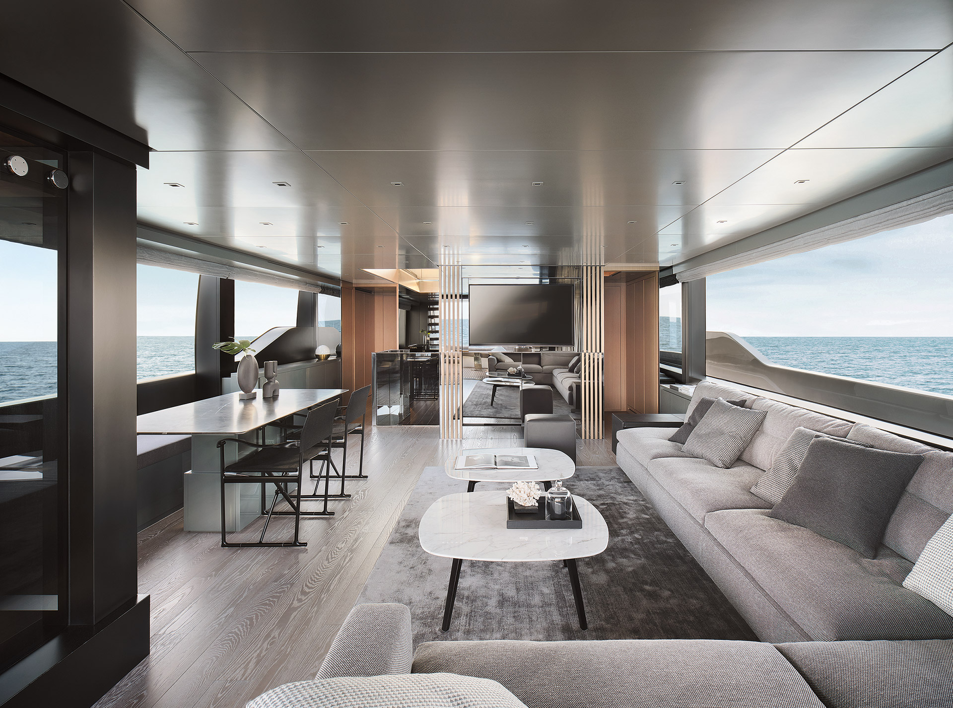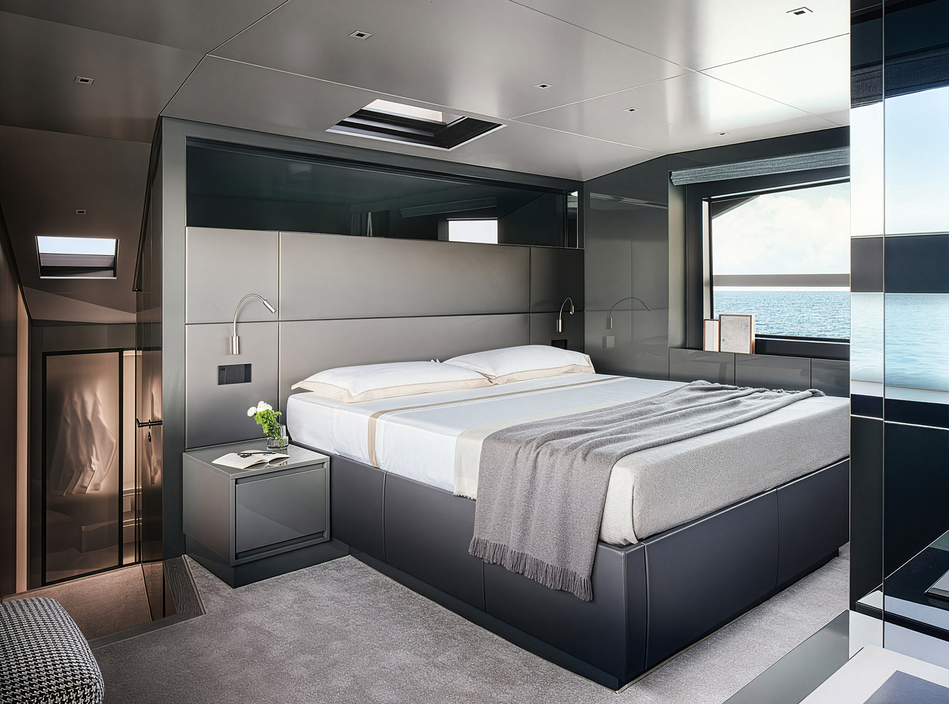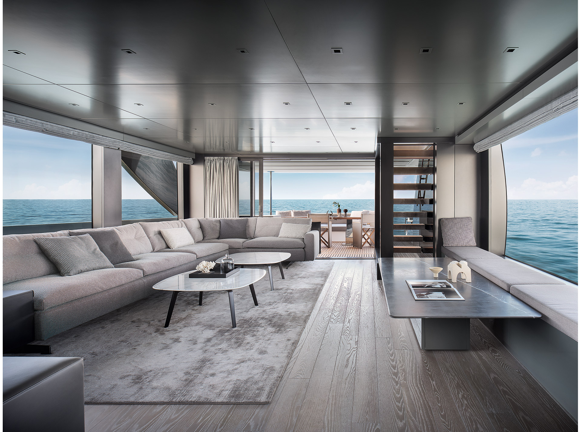 Un layout innovativo valorizza lo spazio grazie all’asimmetria, collocando salone e cabina armatoriale sullo stesso livello. Le finestre a tutta altezza aumentano la luminosità e la sensazione di apertura.