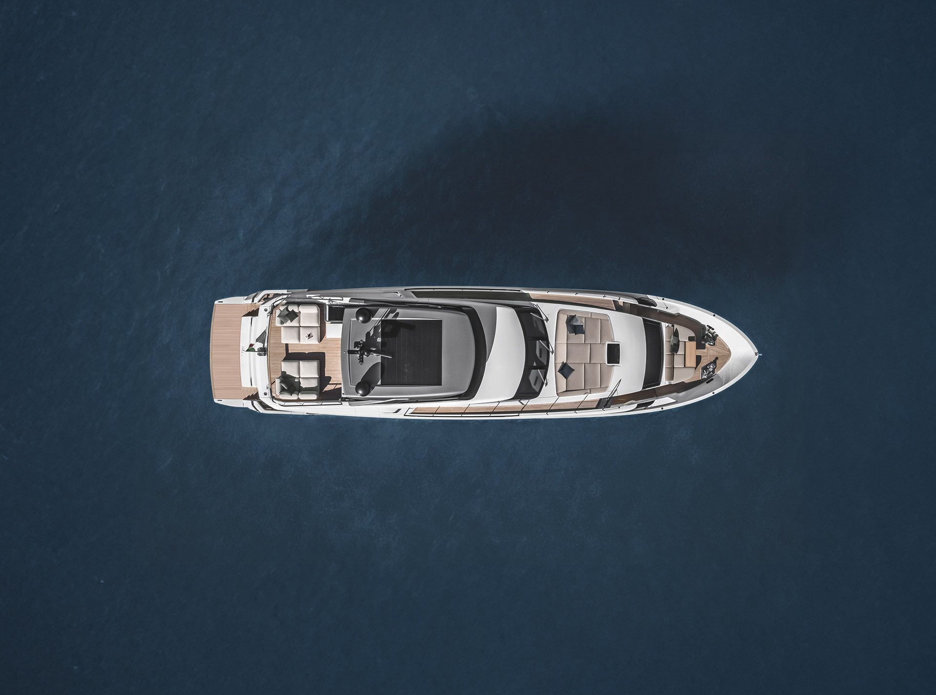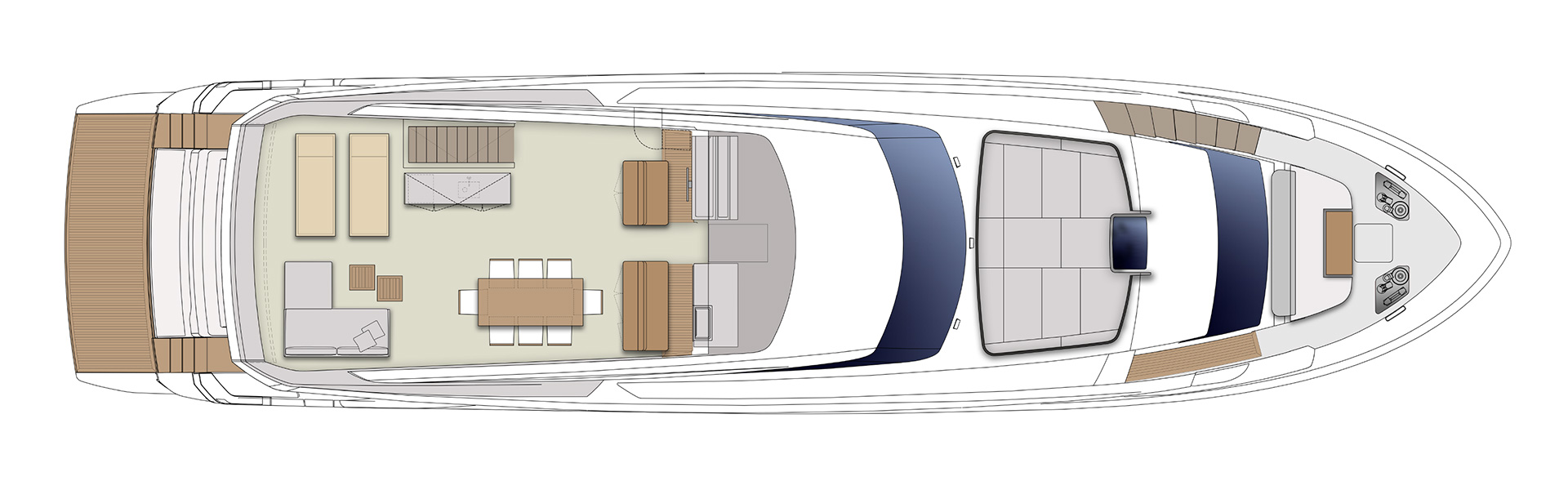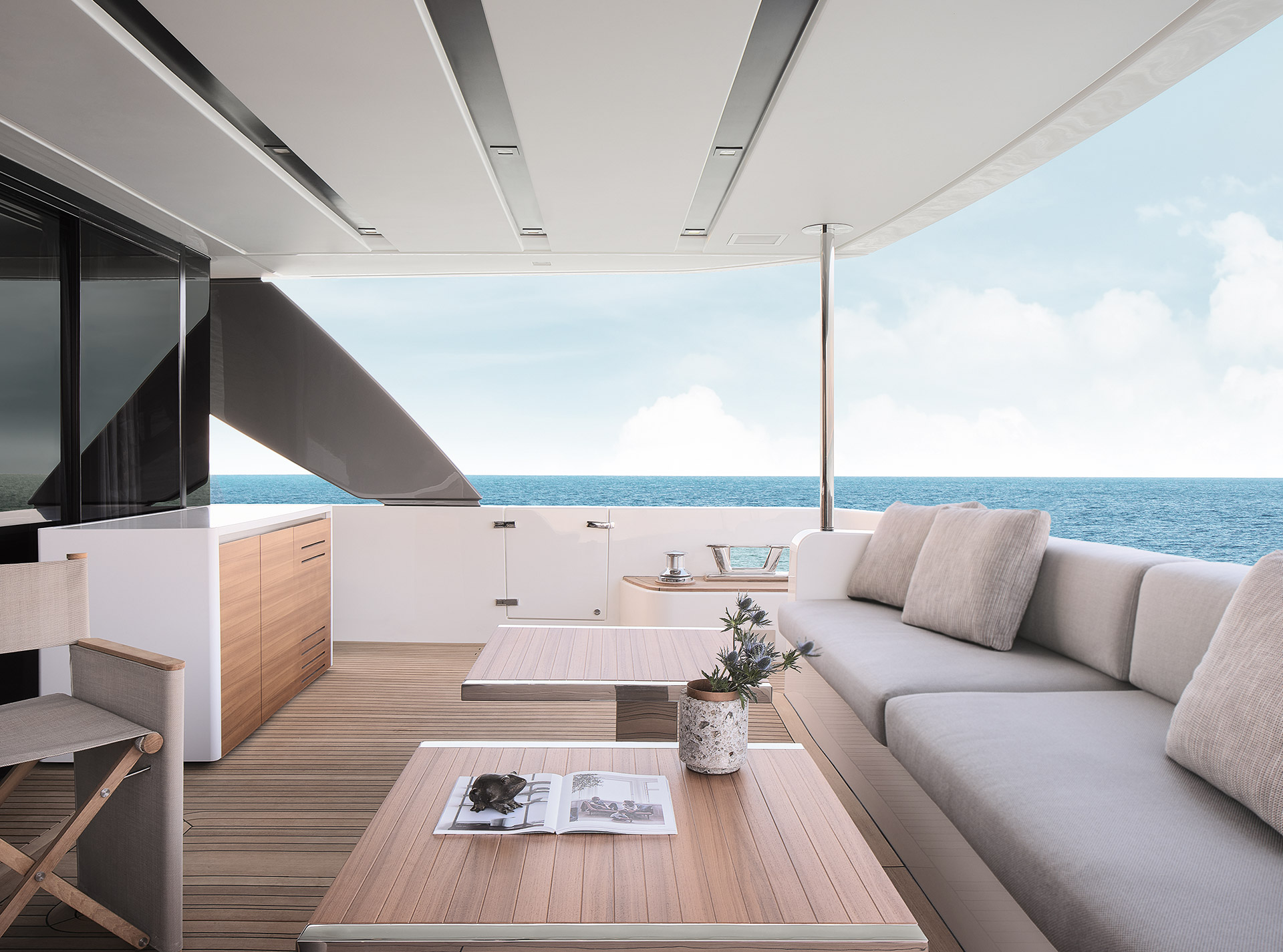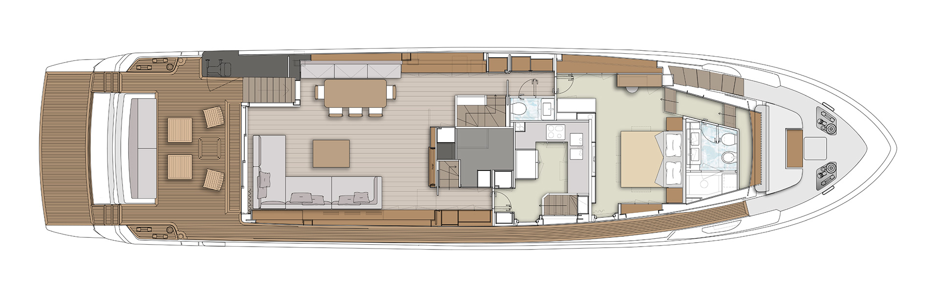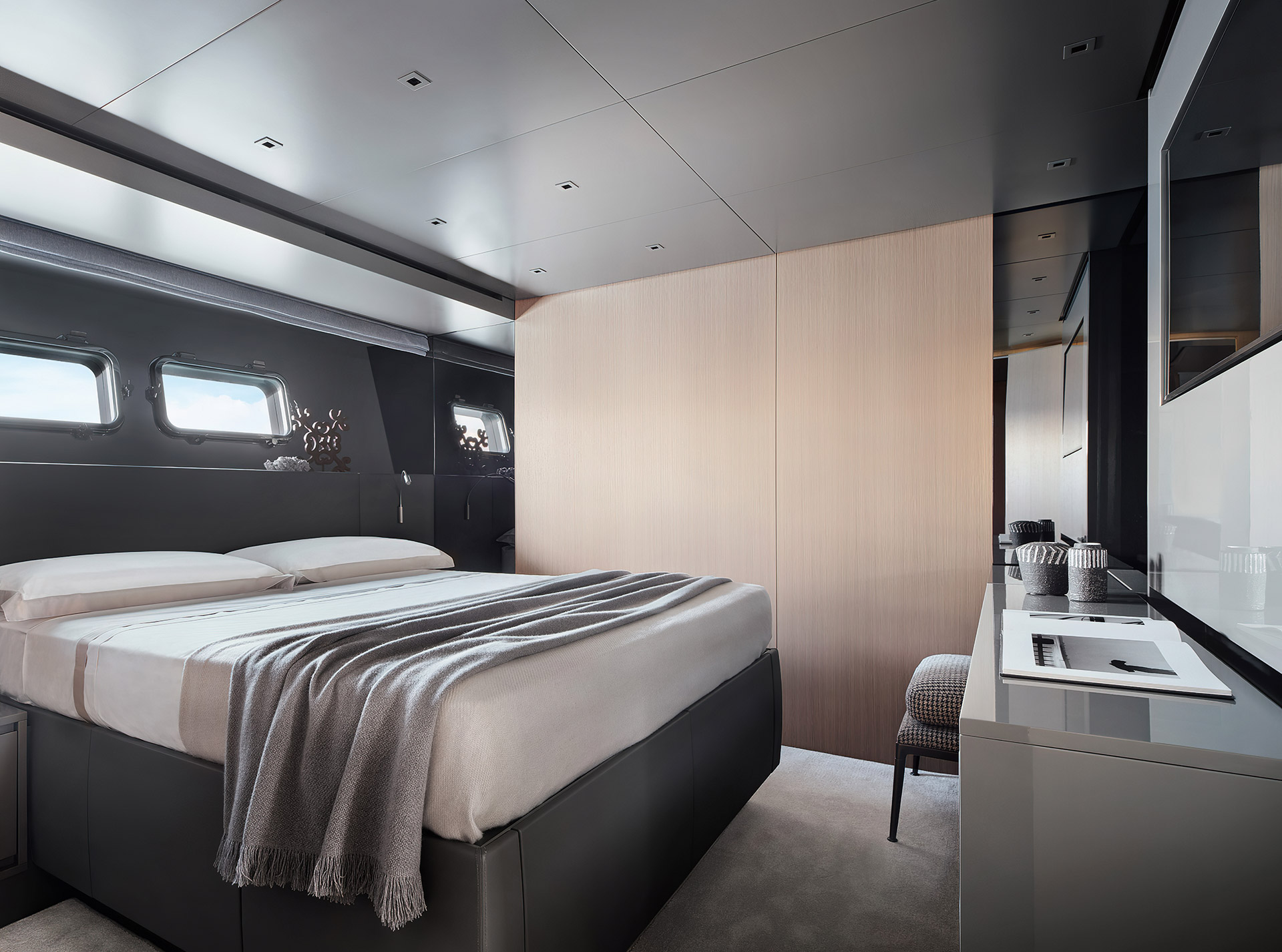 Un layout innovativo valorizza lo spazio grazie all’asimmetria, collocando salone e cabina armatoriale sullo stesso livello. Le finestre a tutta altezza aumentano la luminosità e la sensazione di apertura.