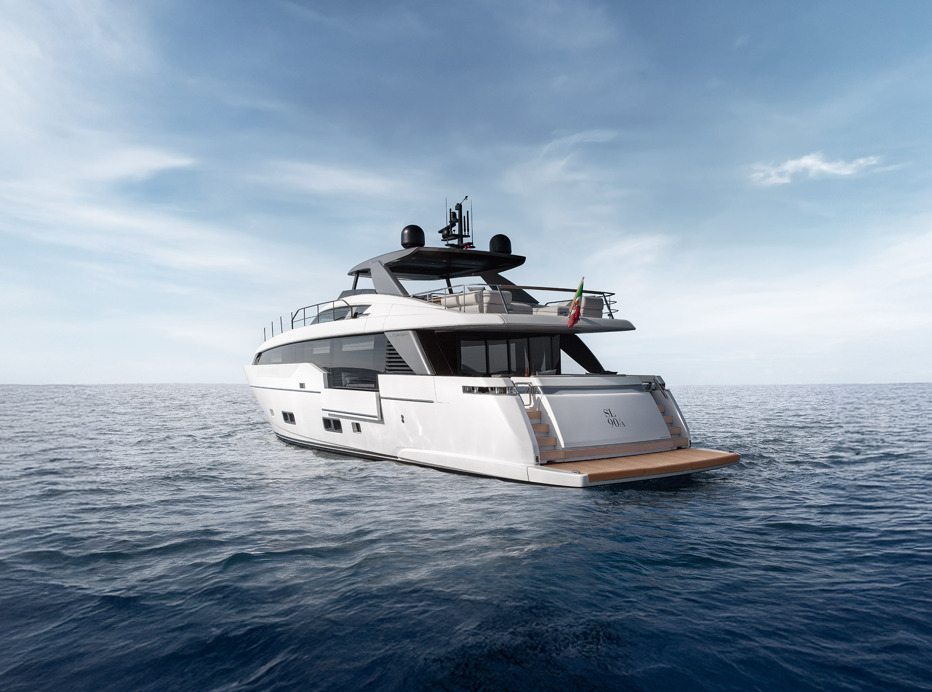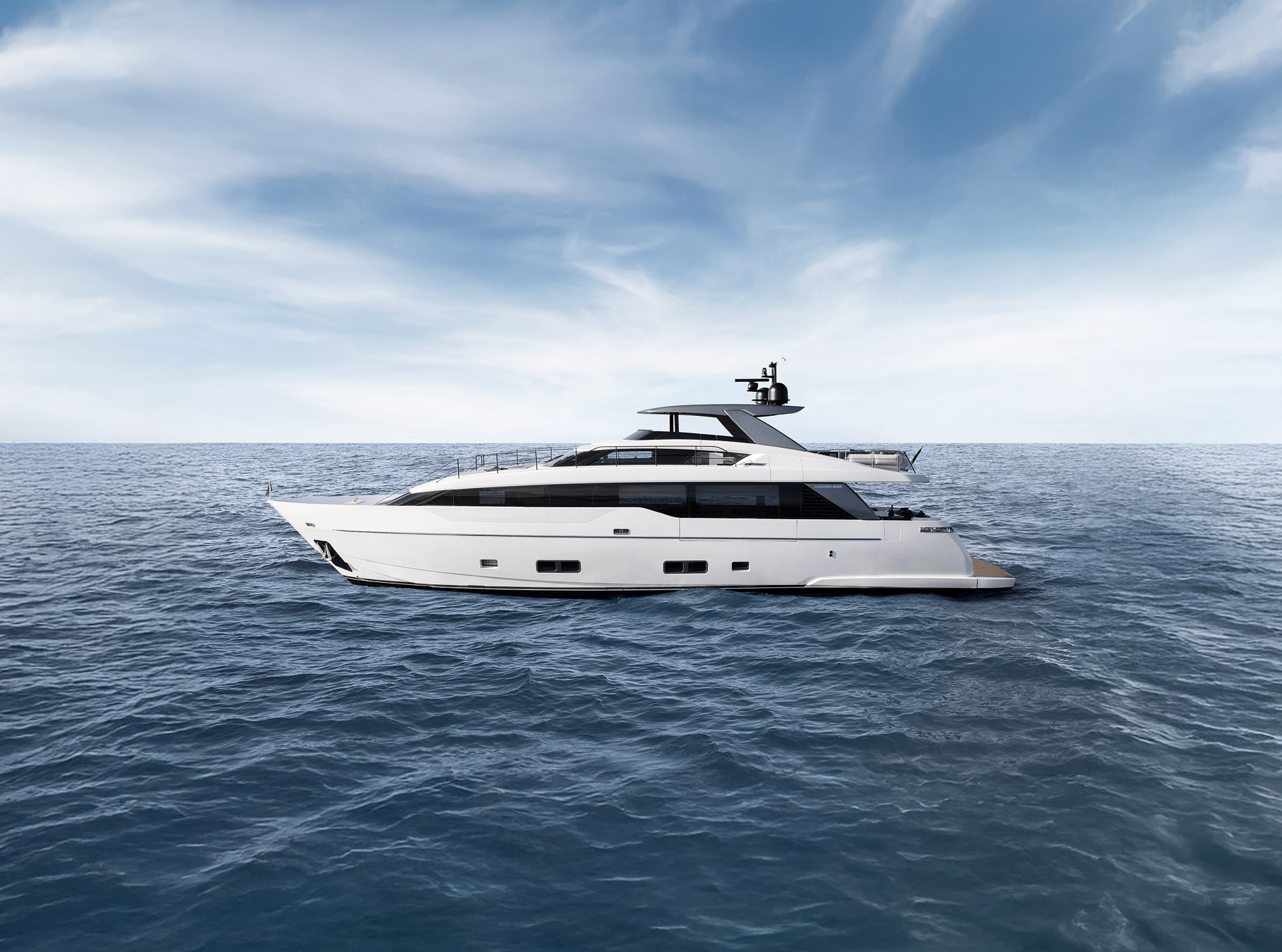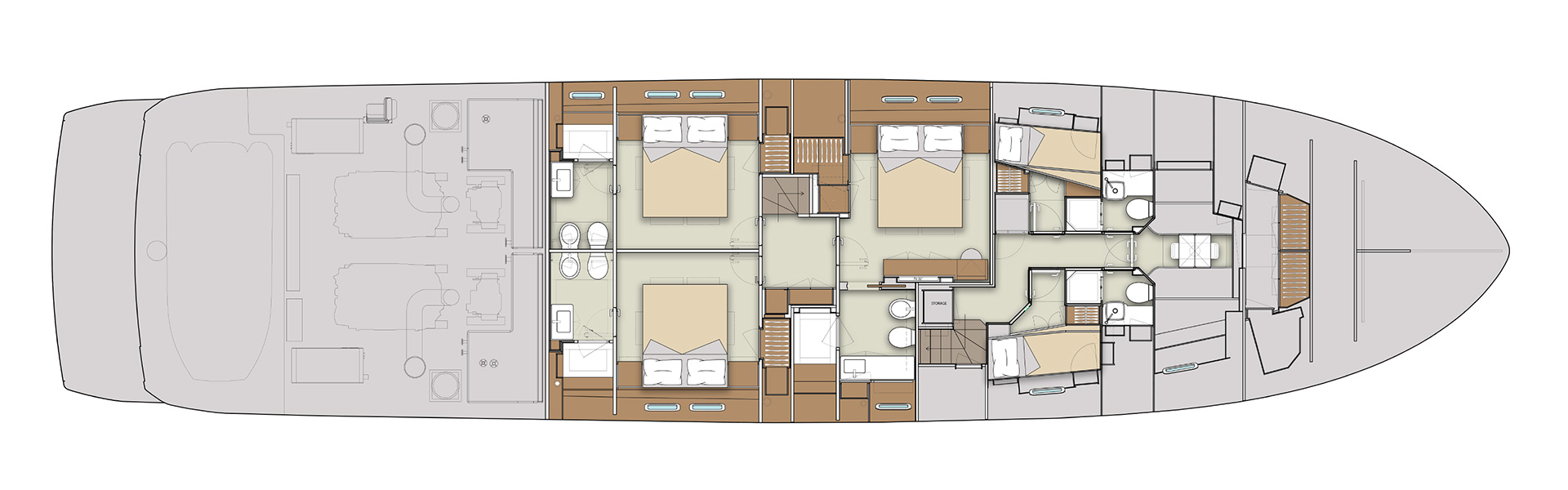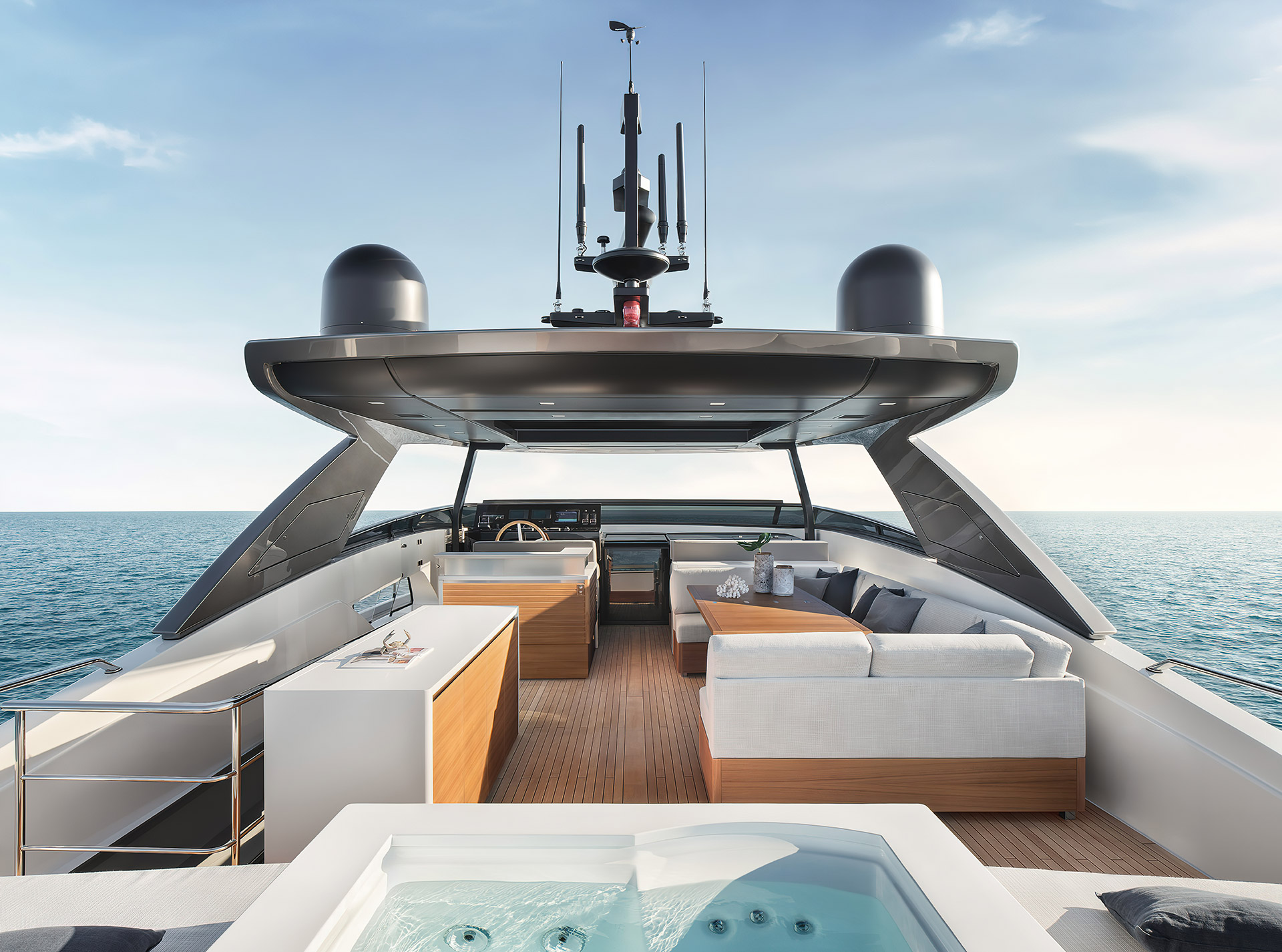 Un layout innovativo valorizza lo spazio grazie all’asimmetria, collocando salone e cabina armatoriale sullo stesso livello. Le finestre a tutta altezza aumentano la luminosità e la sensazione di apertura.