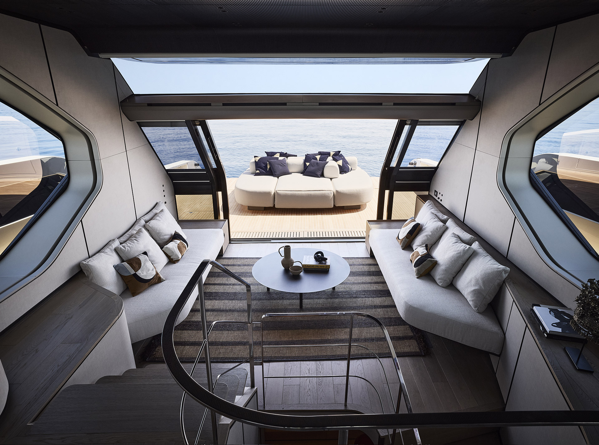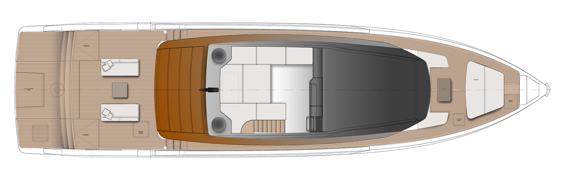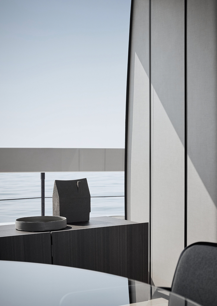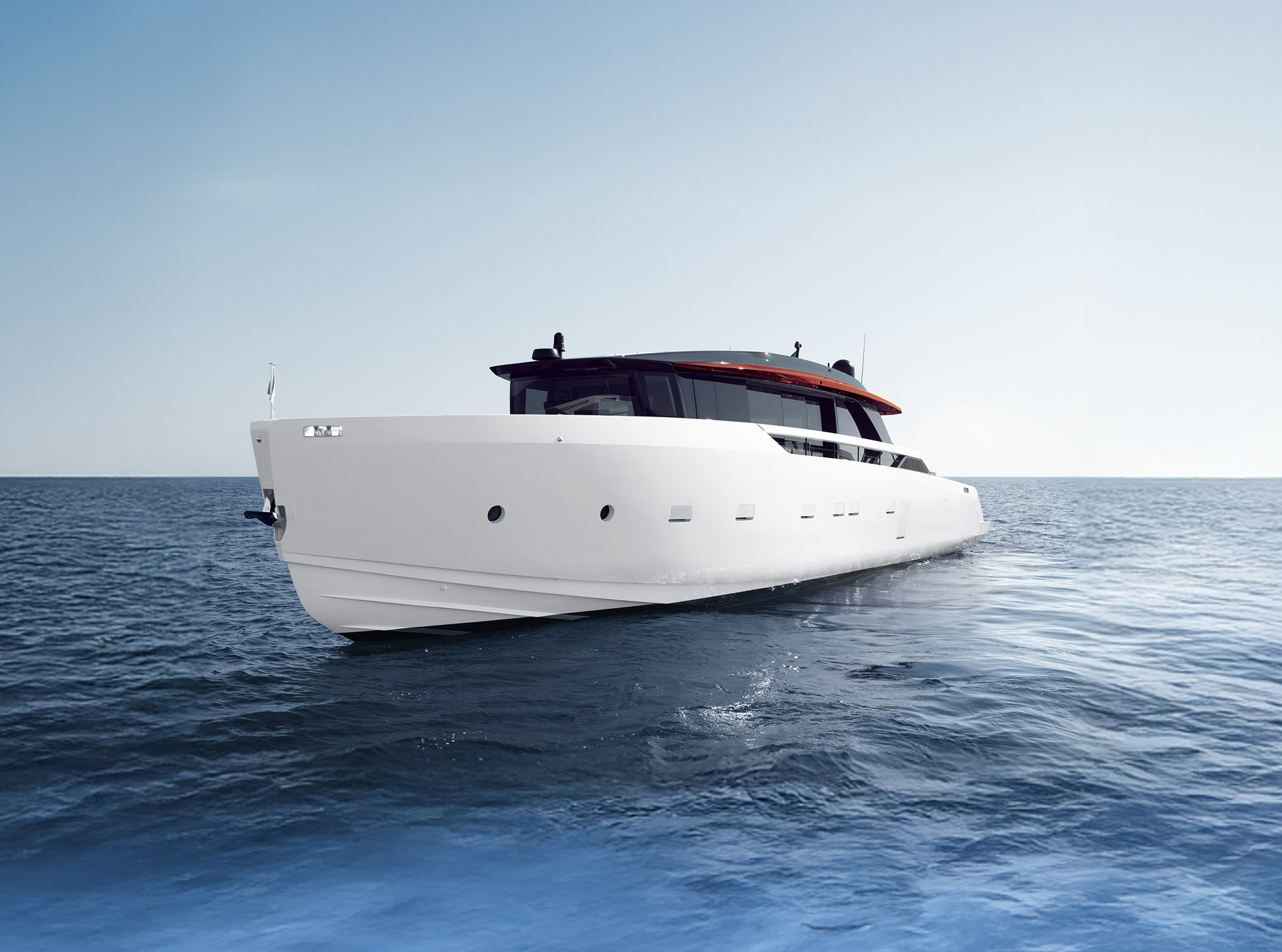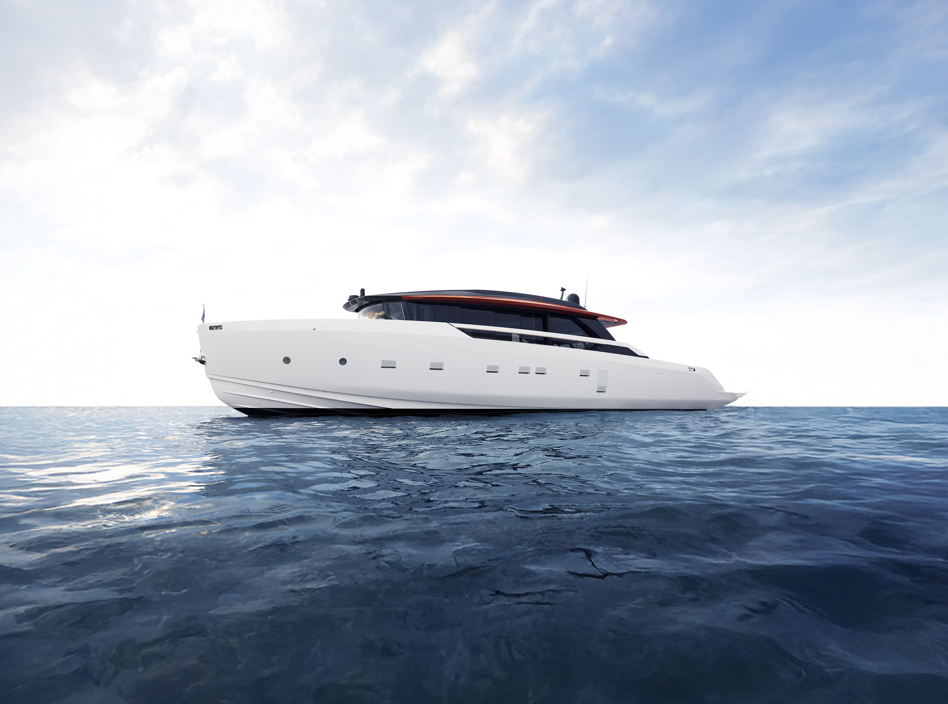 Linee pulite e minimali definiscono gli esterni, dove sportività ed equilibrio convivono. La lama color rame, le ampie vetrate e la beach area ribassata creano un profilo slanciato che esalta luce, apertura e connessione con il mare.