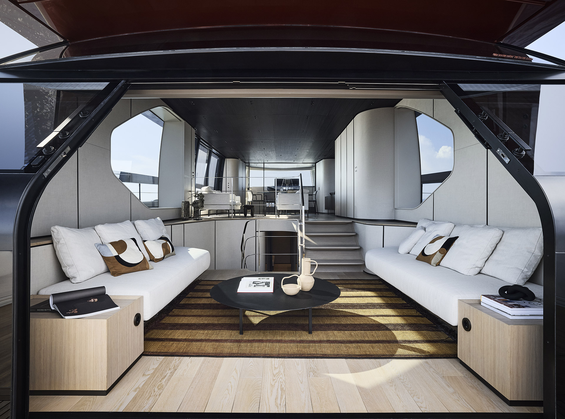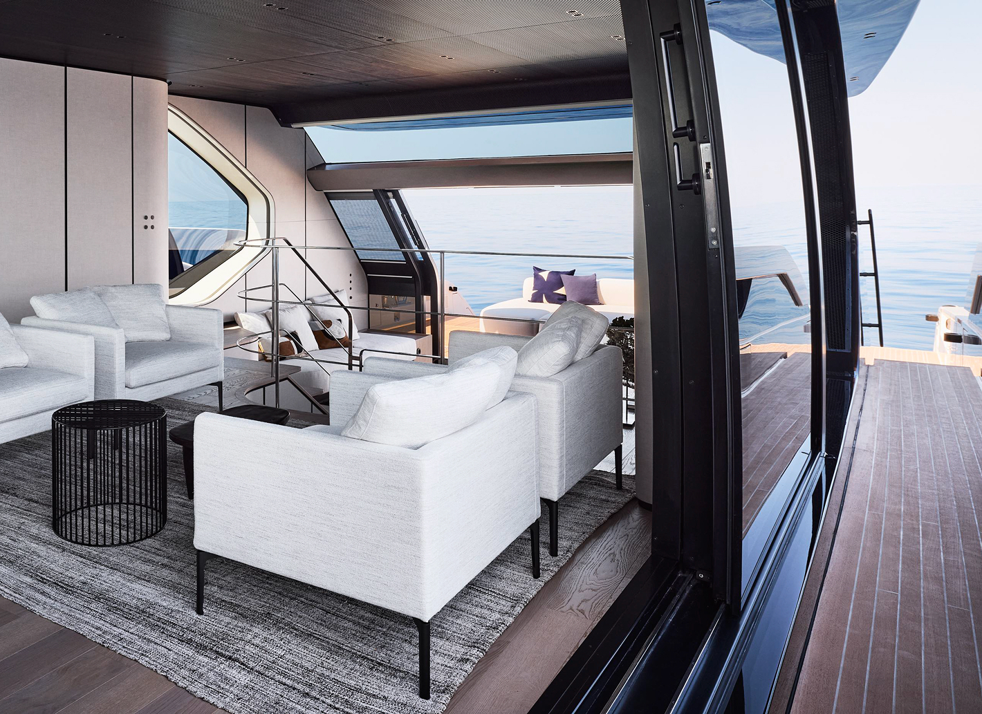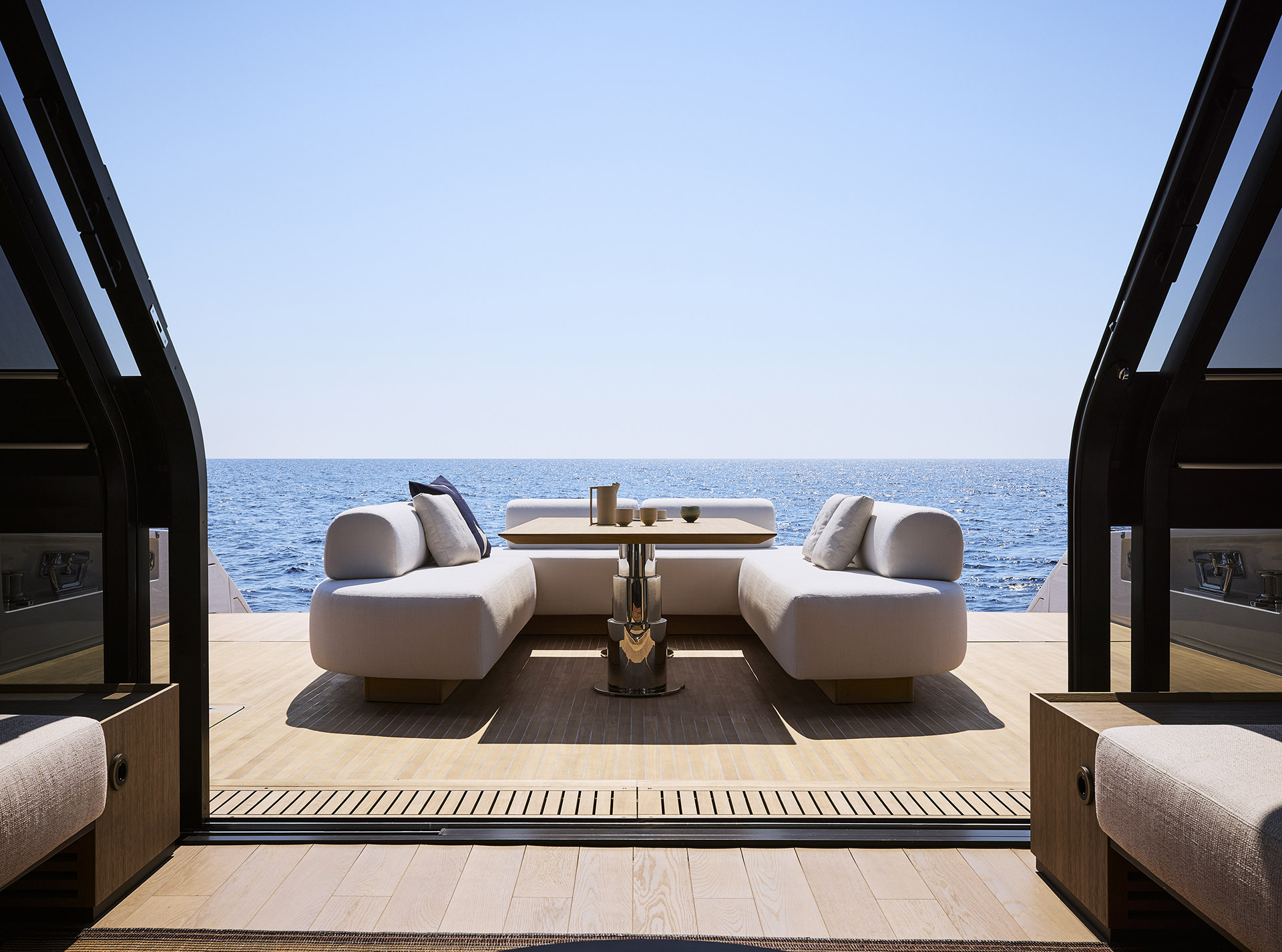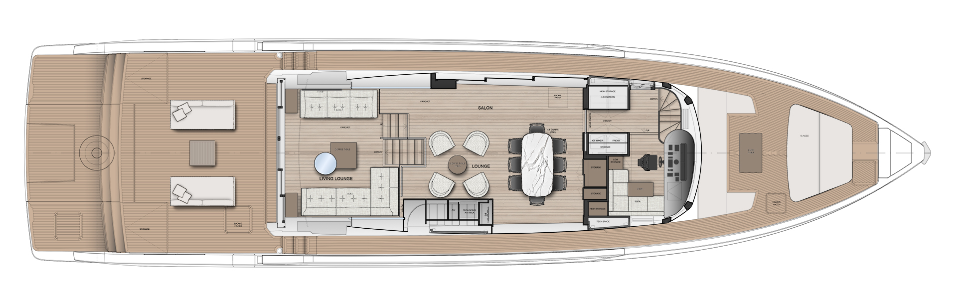 Linee pulite e minimali definiscono gli esterni, dove sportività ed equilibrio convivono. La lama color rame, le ampie vetrate e la beach area ribassata creano un profilo slanciato che esalta luce, apertura e connessione con il mare.