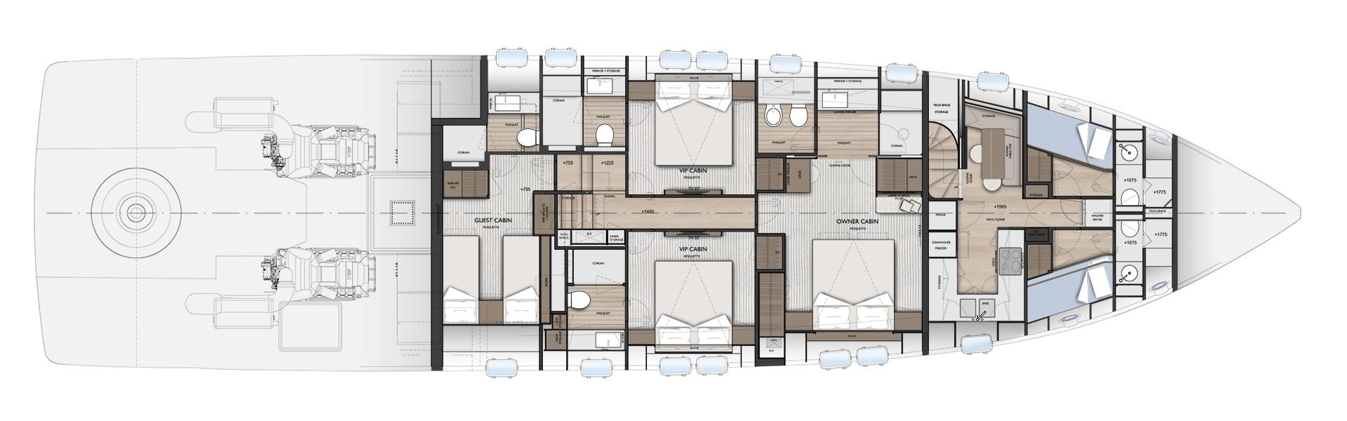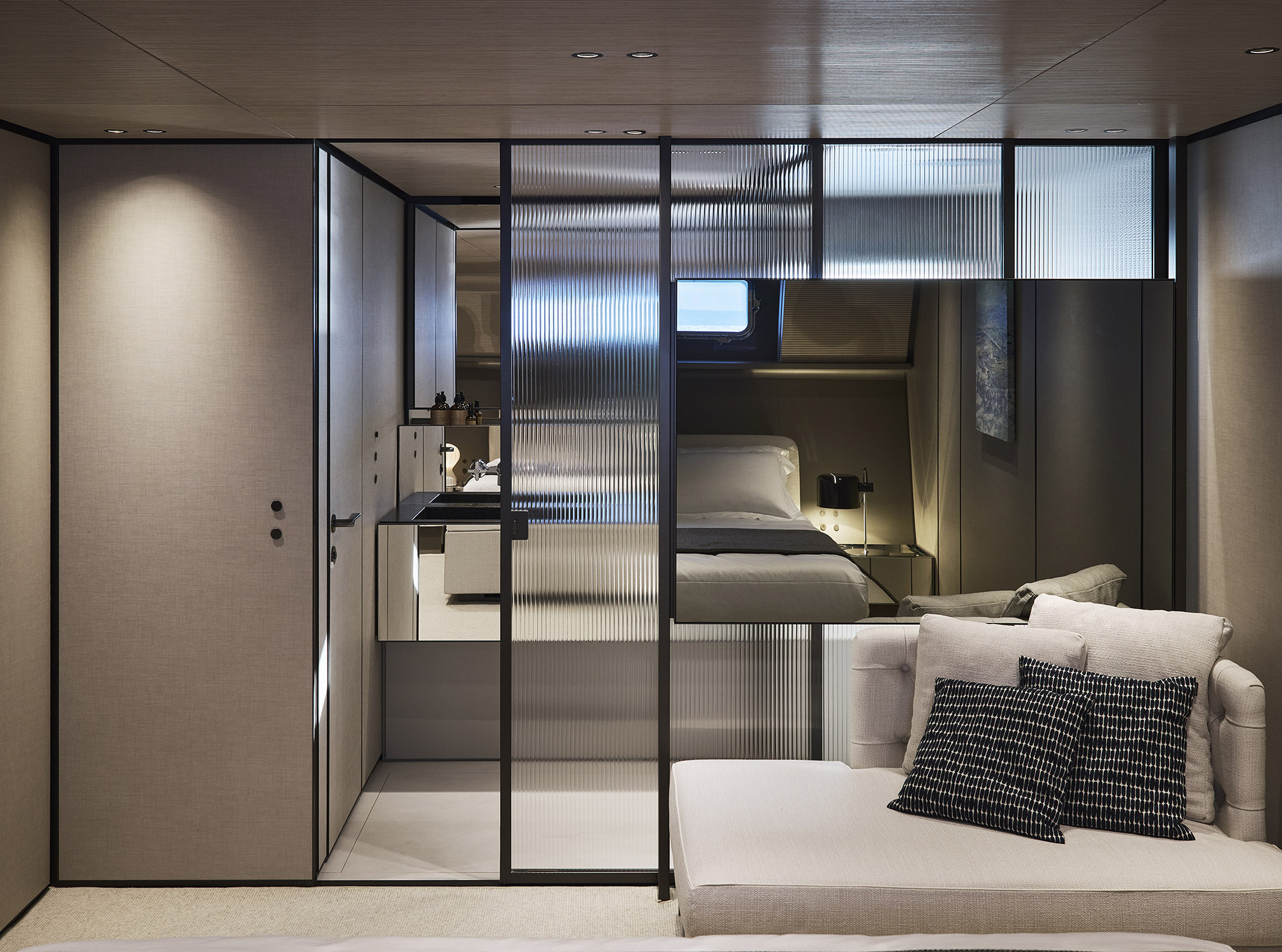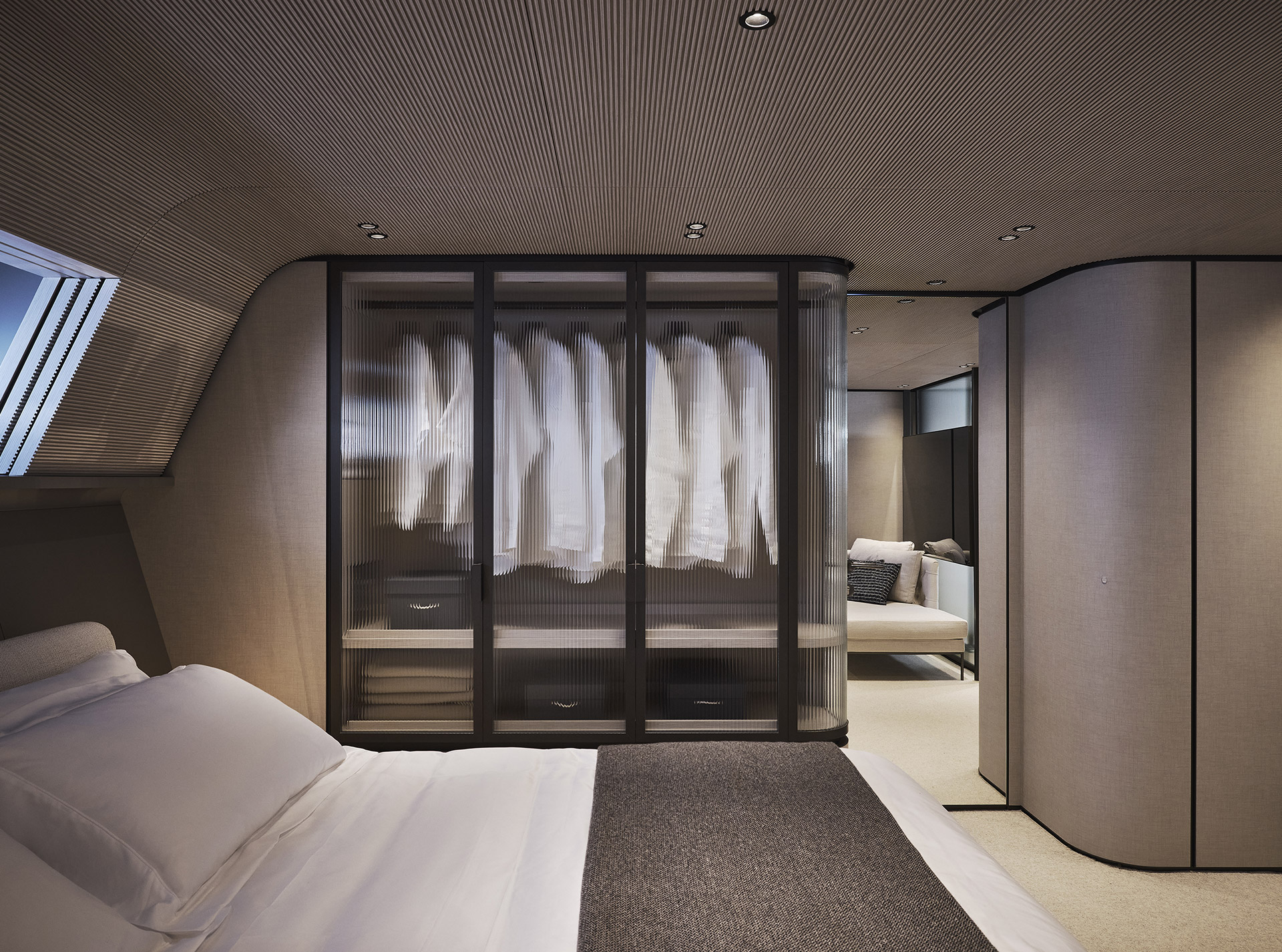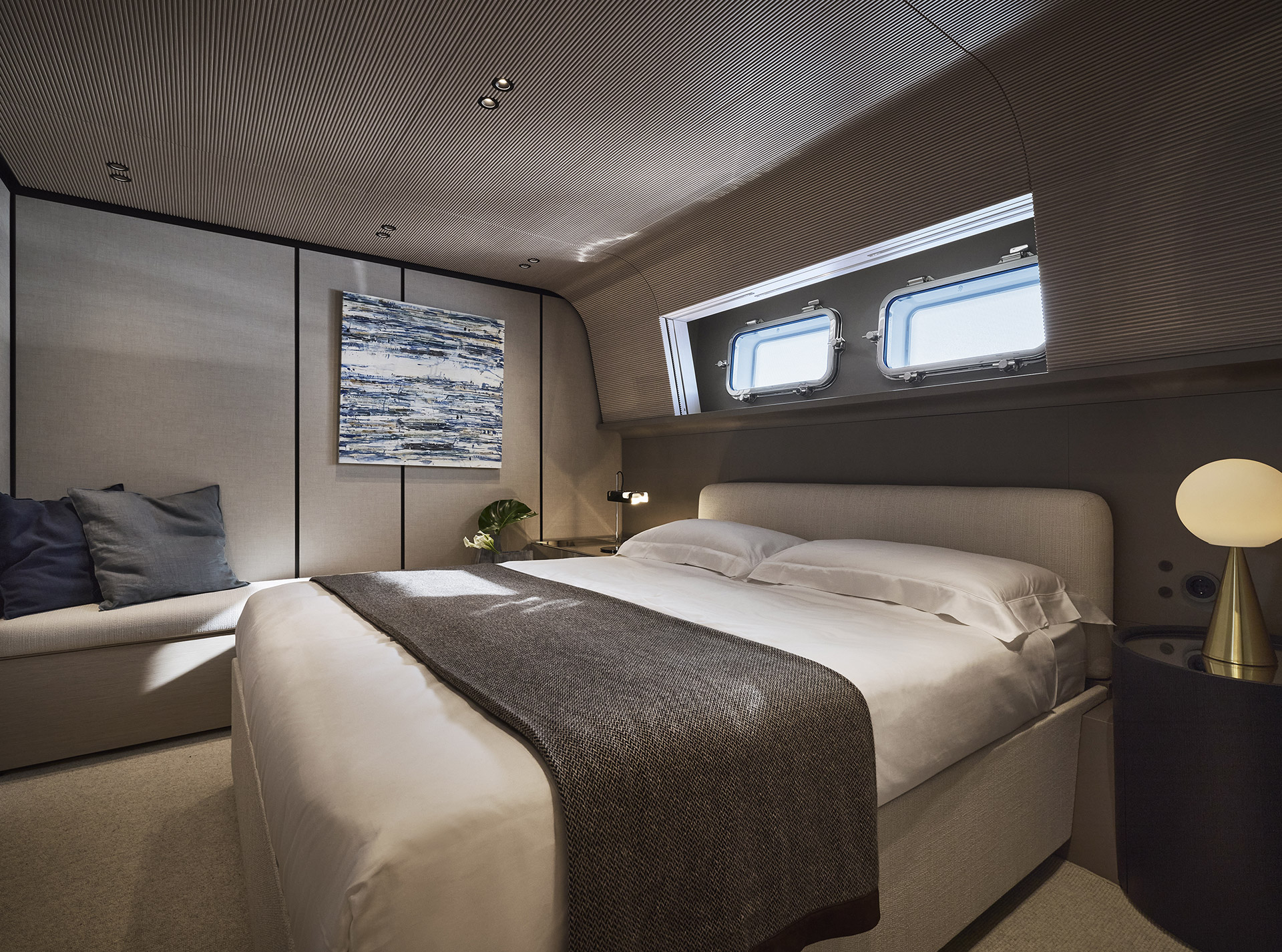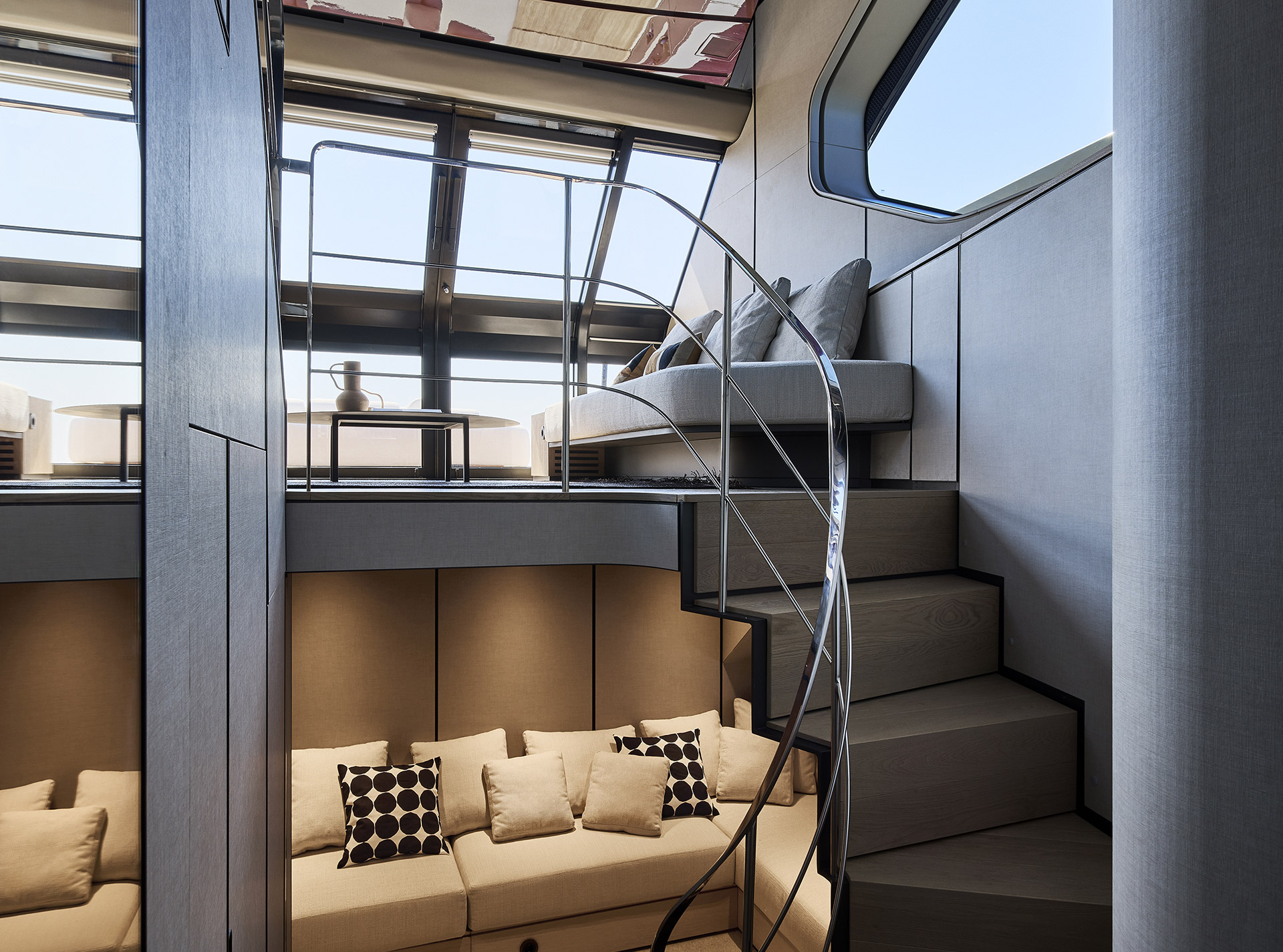 Linee pulite e minimali definiscono gli esterni, dove sportività ed equilibrio convivono. La lama color rame, le ampie vetrate e la beach area ribassata creano un profilo slanciato che esalta luce, apertura e connessione con il mare.