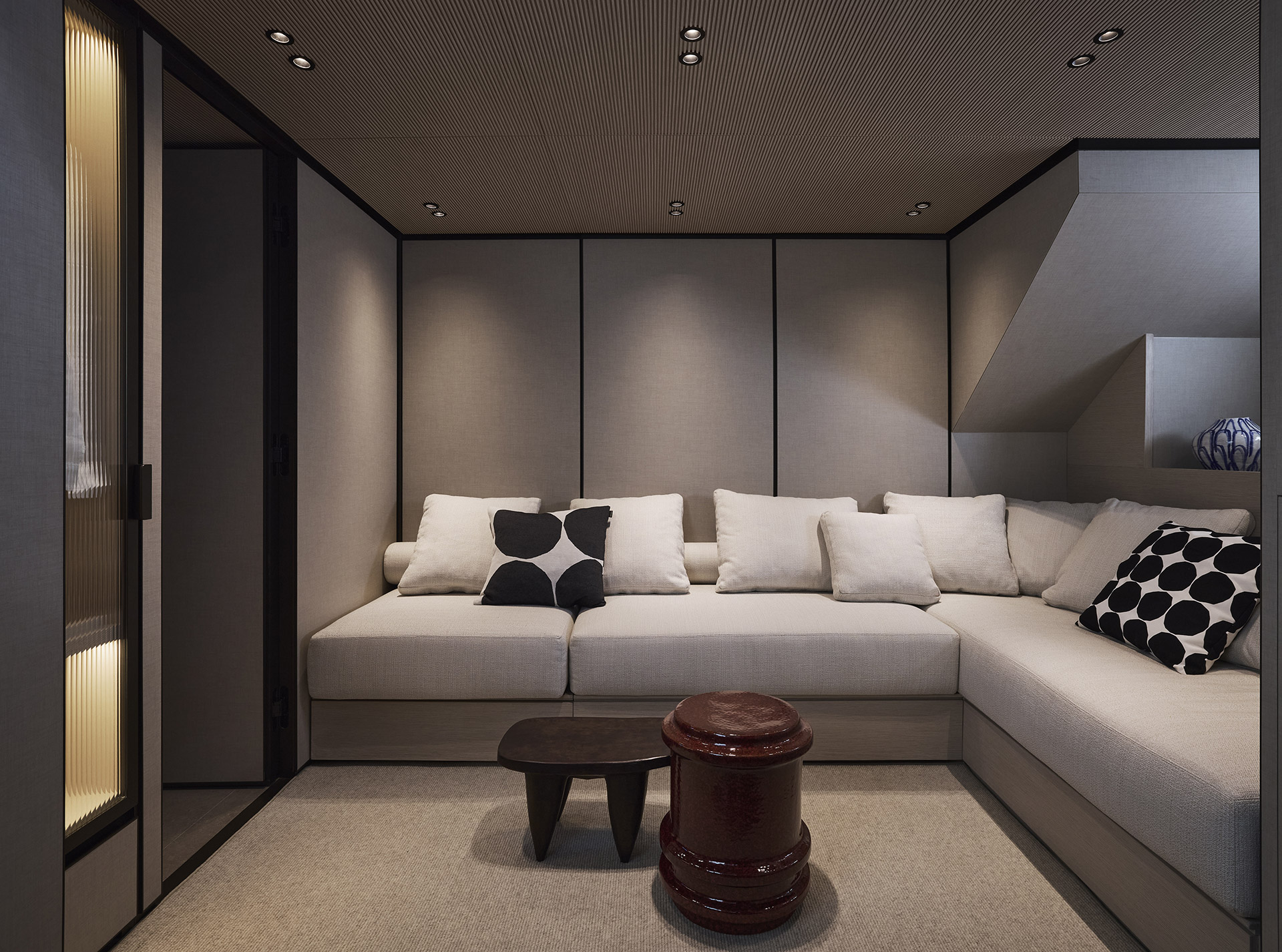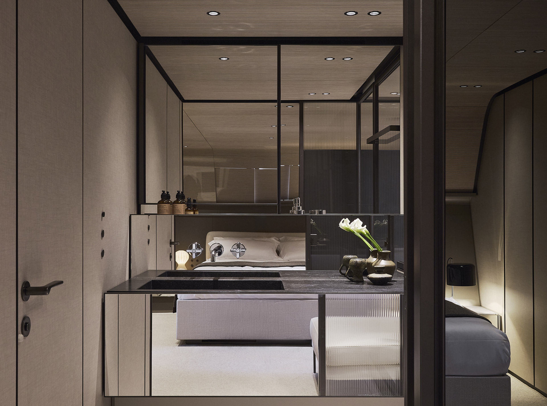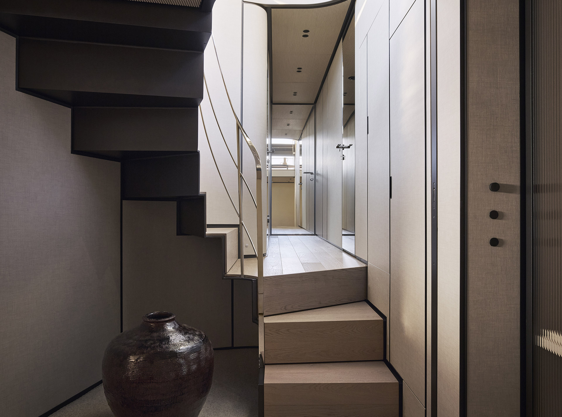 Gli interni si sviluppano su quattro livelli fluidi, definiti da leggerezza e chiarezza architettonica. Volumi a doppia altezza, grandi superfici vetrate e materiali sobri dissolvono i confini, creando spazi raffinati in continuità con l’esterno.