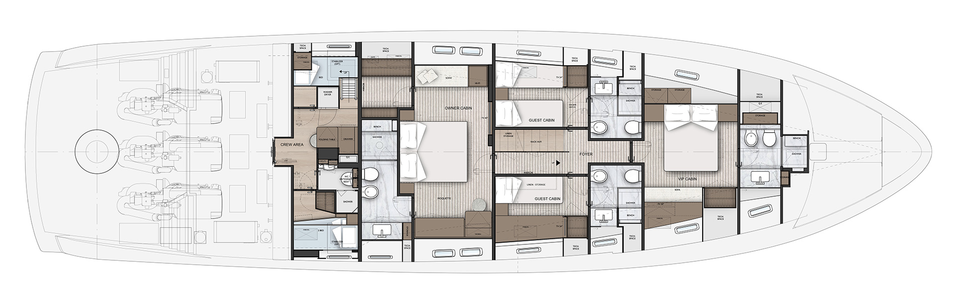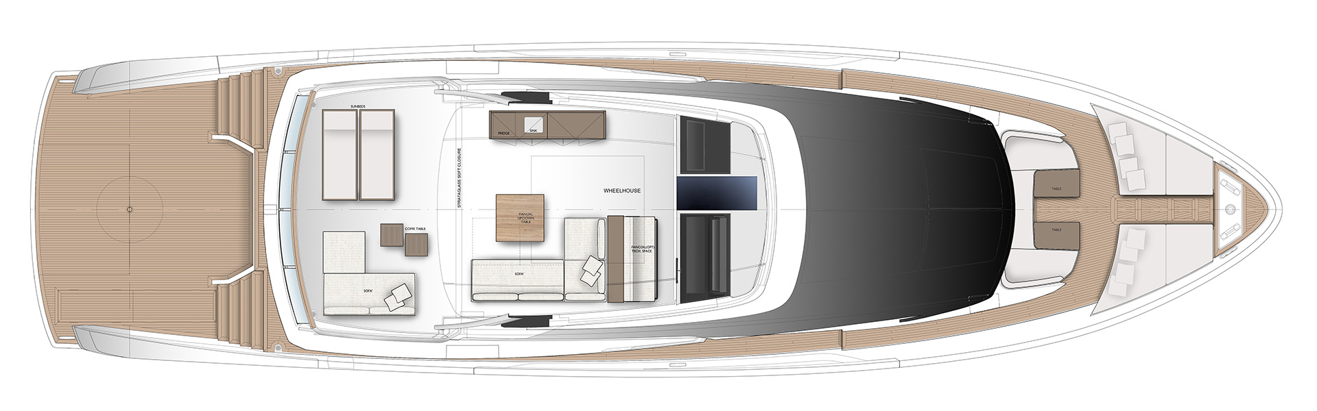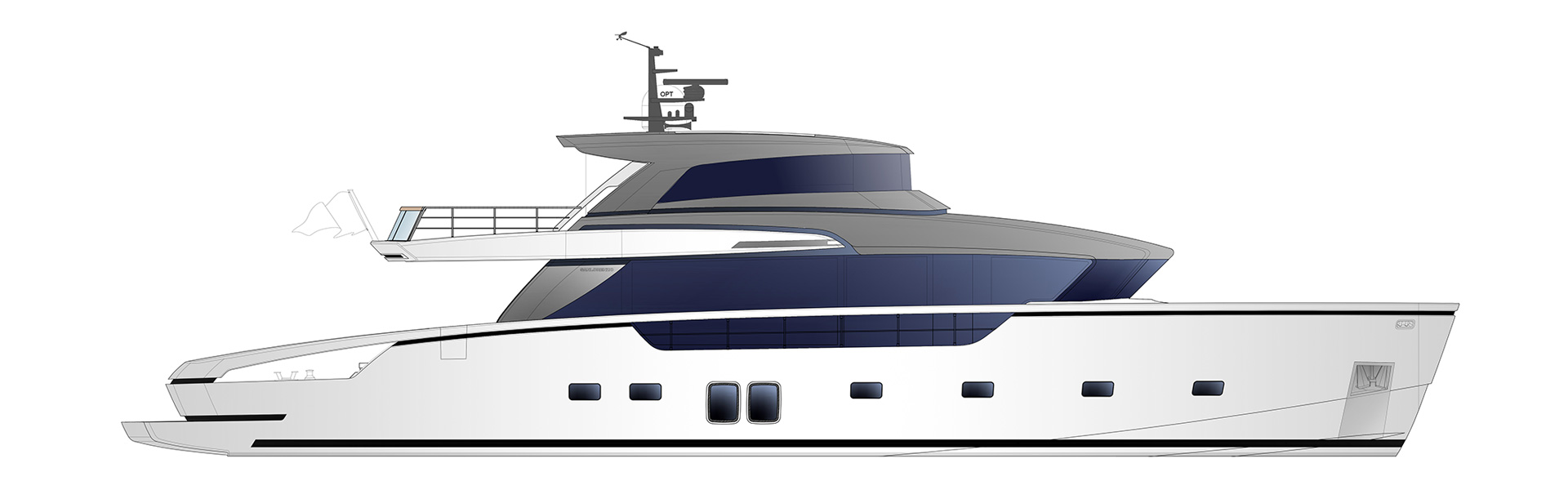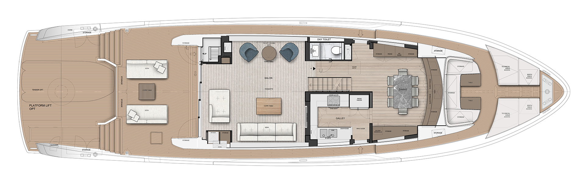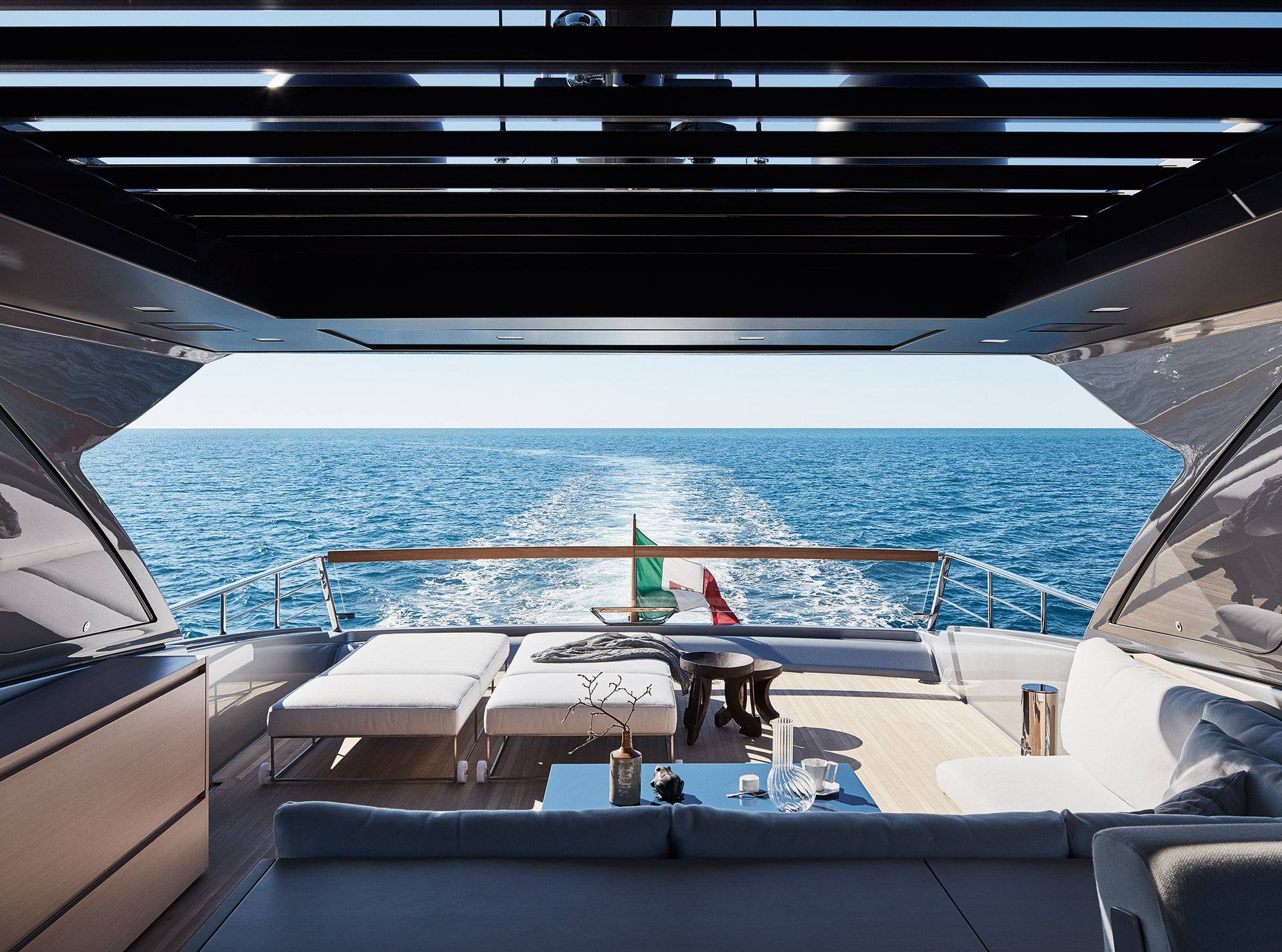 L’esterno unisce proporzioni crossover decise a linee raffinate. Un layout innovativo crea un main deck privato, ispirato ad un loft, che fluisce senza interruzioni da poppa a prua. Ogni superficie bilancia forza ed eleganza per una vita in mare naturale.